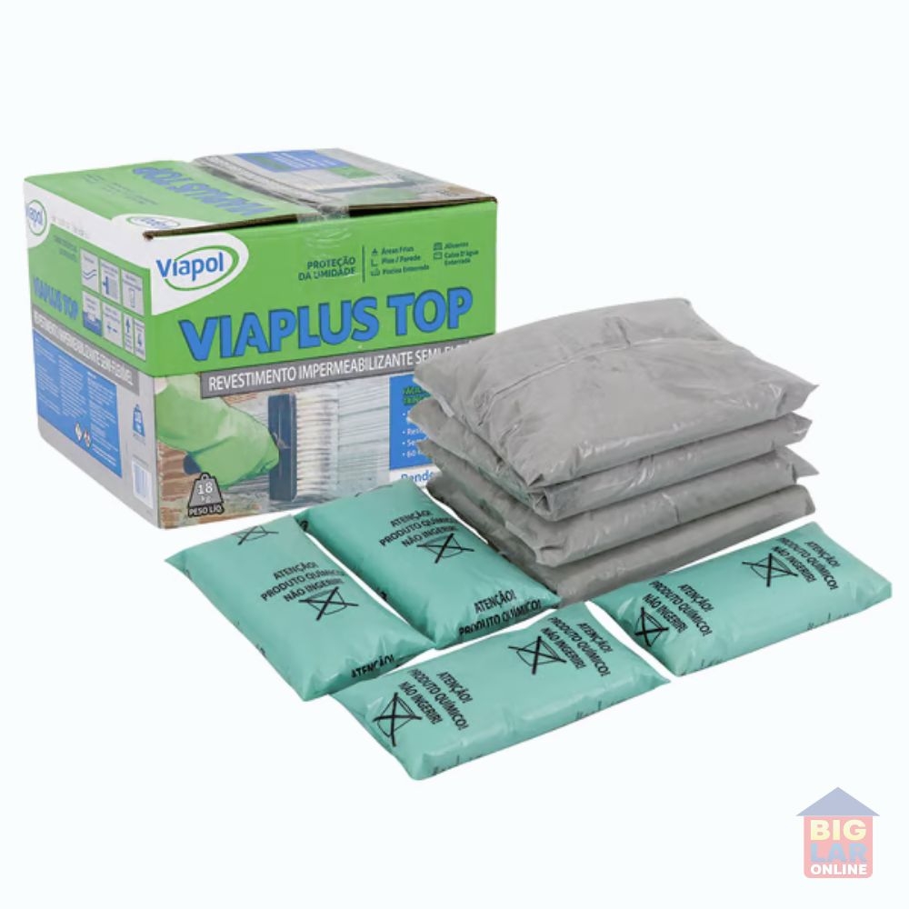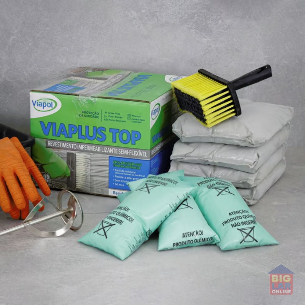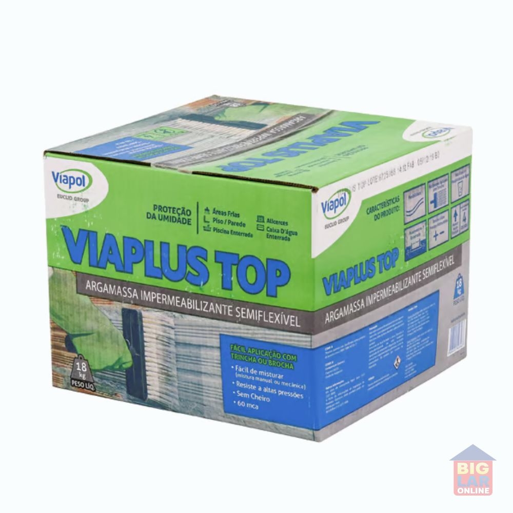 Uso Indicado: Viaplus Top é utilizado para impermeabilização de subsolos, cortinas, poços de elevadores, muros de arrimo, baldrames, paredes internas e externas, pisos frios em contato com o solo, reservatório de água potável enterrado, piscinas em concreto enterradas e estruturas sujeitas a infiltração do lençol freático. Indicado como revestimento sobre contra piso antes de receber o assentamento de pisos cerâmicos.