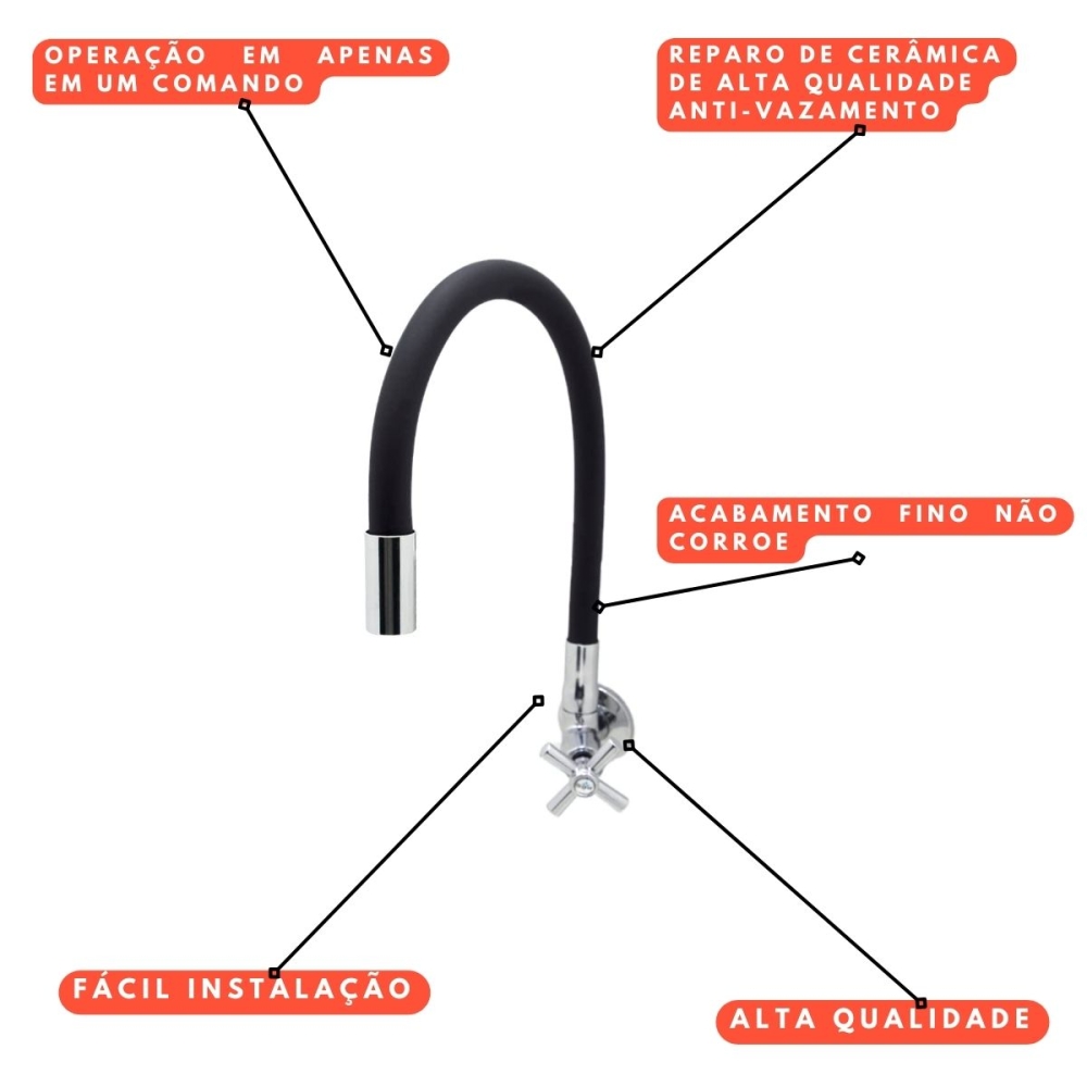 A Torneira Tubo Flexível Parede Cozinha Color Preta Luxo é ideal para quem procura uma torneira contemporânea e prática. Com sua alavanca com acionamento de 1/4 de volta e tubo flexível com alcance de 360 graus, oferece excelente alcance para o direcionamento do jato de água. O arejador assegura um jato uniforme e espumante.