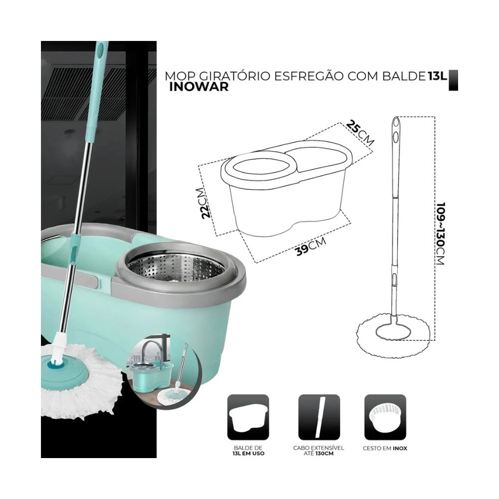 Especificações: - Balde: 39cm x 22cm x 25cm - Capacidade Total: 13 litros - Cabo: Ajustável até 130cm - Refis: Inclui 2 refis de microfibra