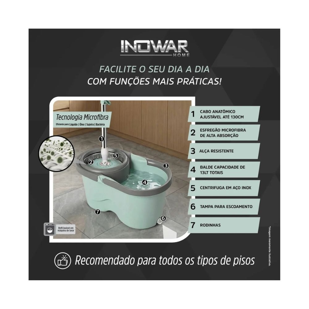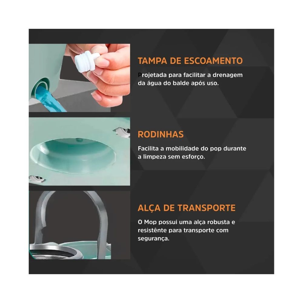 > Conforto Total: Com um cabo ajustável até 130cm e ergonômico, ele se adapta à sua altura e facilita alcançar locais difíceis. Sua estrutura leve, combinada com rodinhas suaves, permite que você mova o balde sem esforço entre os cômodos.