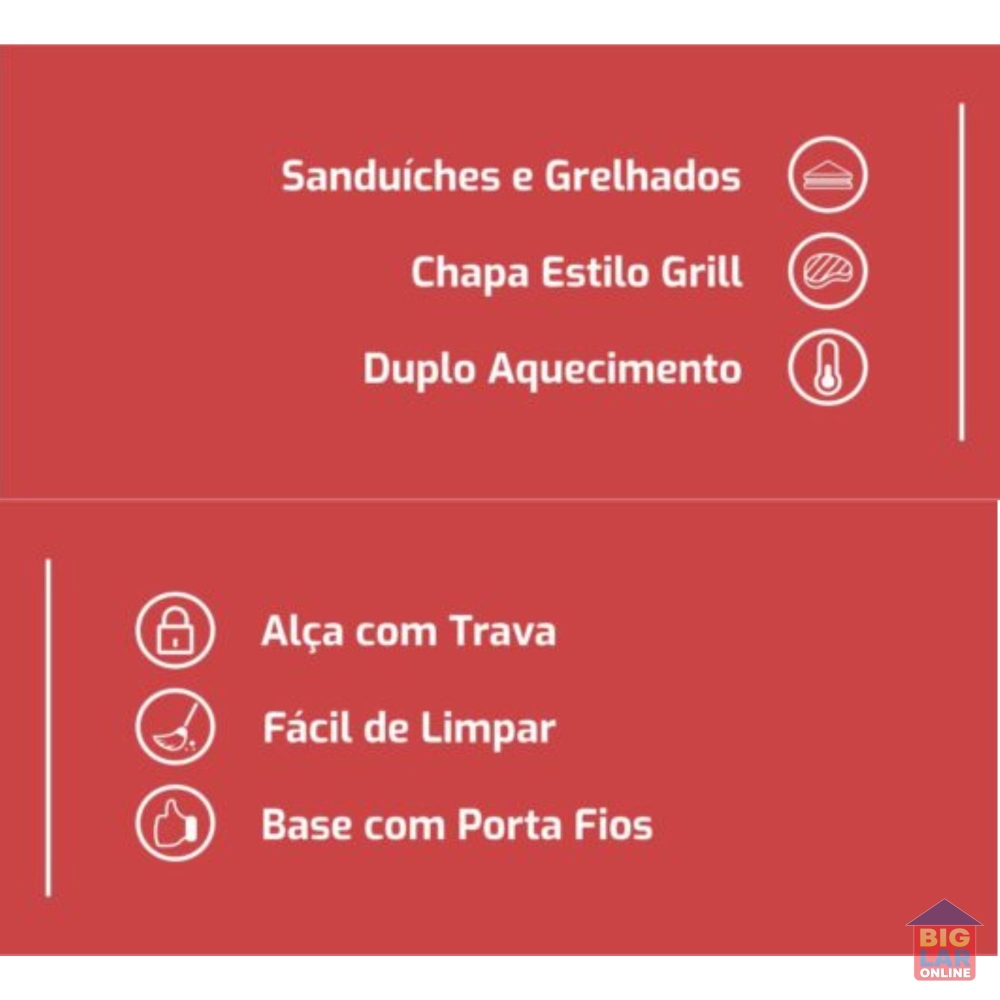 • Sanduicheira e grill • Chapas estilo grill • Chapa antiaderente • Alça com trava • Luz de funcionamento