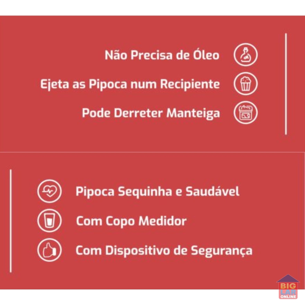 • Saudável Pipoca sequinha, crocante e quentinha. • Sem óleo Prepara pipocas sem o uso de nenhum tipo de óleo, através da tecnologia de circulação de ar quente. • Muito segura Dispositivo de segurança contra super-aquecimento. • Fácil de usar Ejeta as pipocas para o recipiente de sua preferência. • Copo medidor Ajuda a medir a quantidade exata para o preparo. • Derrete manteiga O copo medidor pode ser usado para derreter manteiga e n q u a n t o a s p i p o c a s estouram.