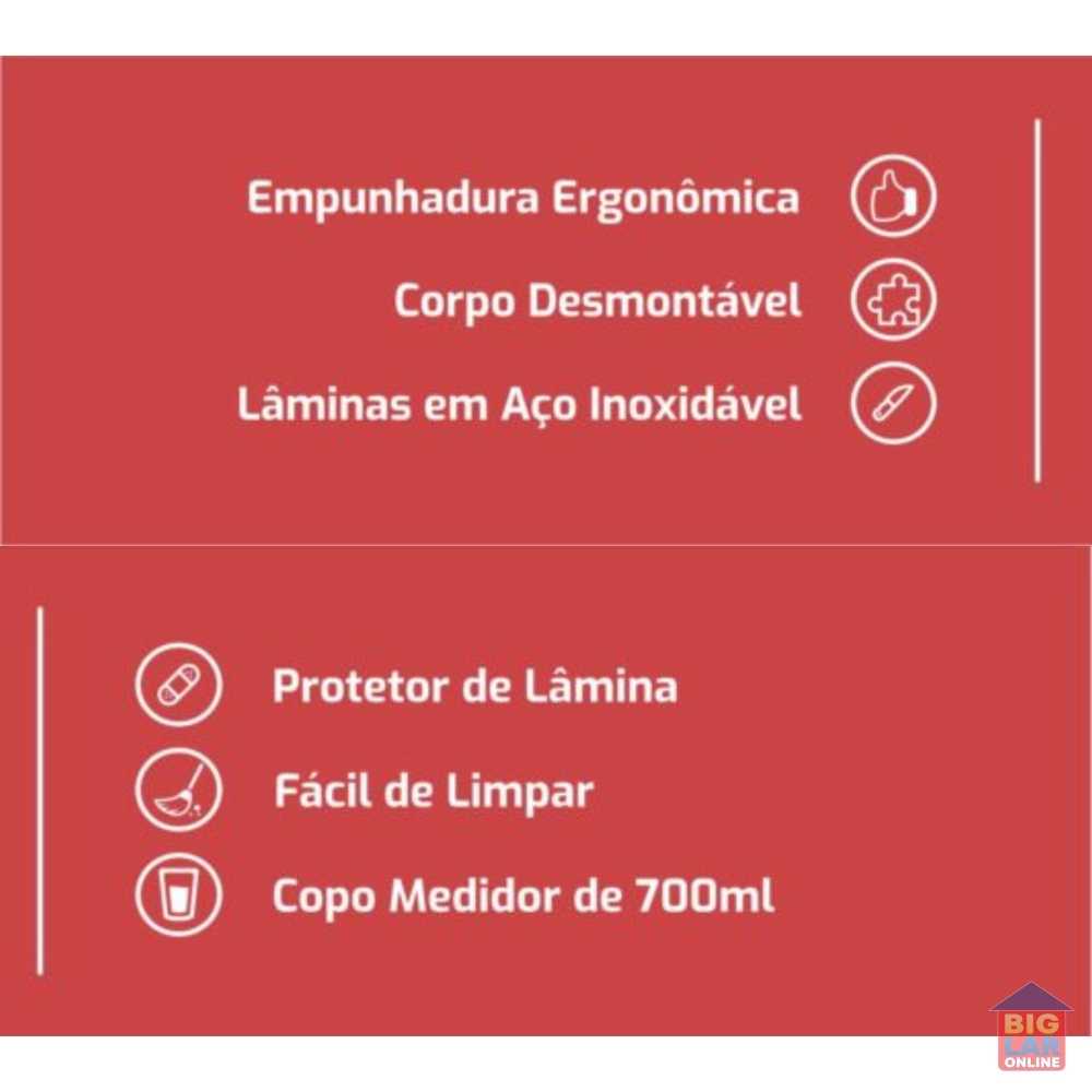 • Com copo medidor Com capacidade de 700ml.