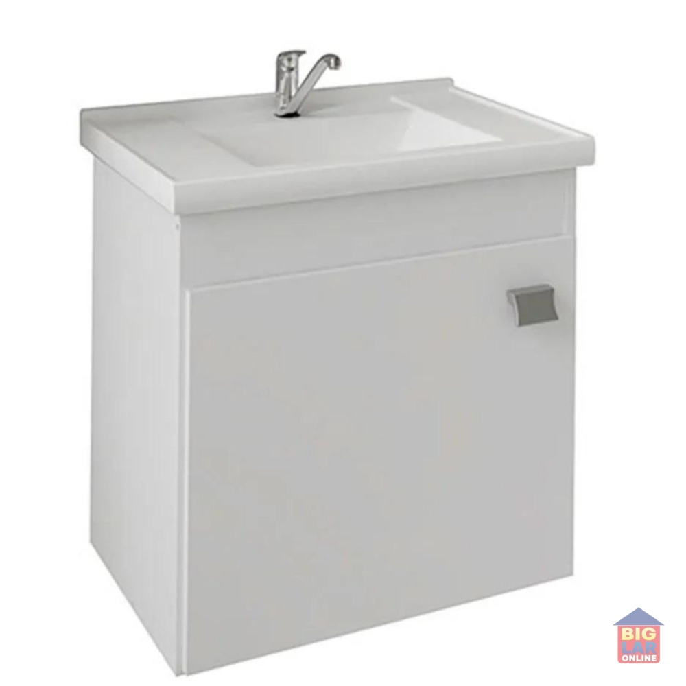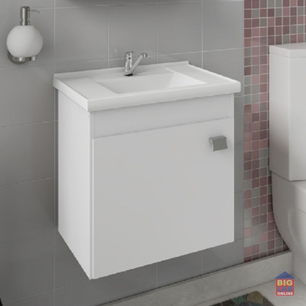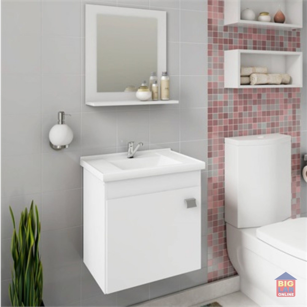 O Gabinete Suspenso para Banheiro da linha Íris da MGM Móveis possui estrutura 100% MDF na cor Branca, tem tamanho de 46x44,8cm e profundidade de 31,5cm. Possui espelheira com uma prateleira, puxador em ABS, com amplo espaço interno e lavatório 100% mármore sintético com mais durabilidade e resistência.