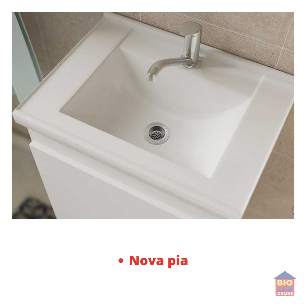 Ele conta com espelheira e tem o tamanho ideal para banheiros mais estreitos: