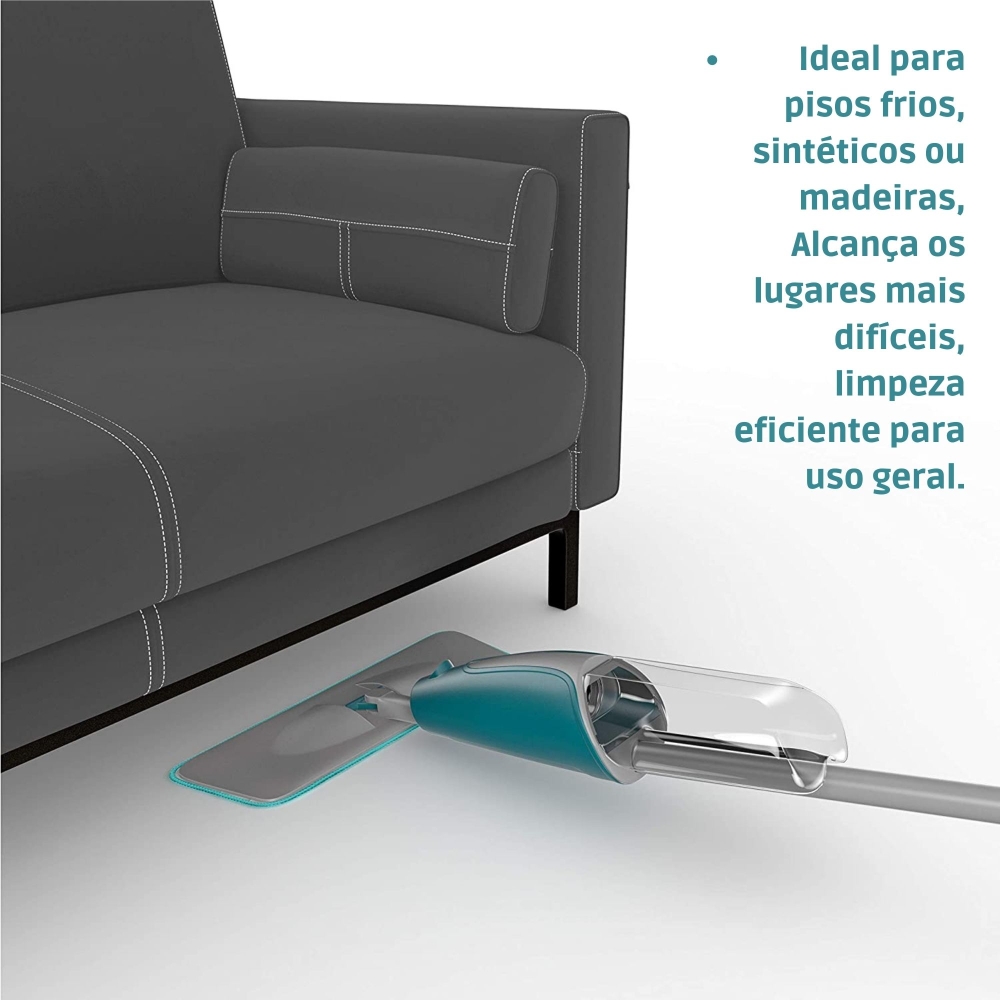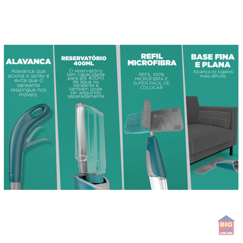 O spray é acionado facilmente por uma alavanca posicionada ao alcance de suas mãos. O refil de microfibra é lavável e pode ser substituído ao final de sua vida útil.