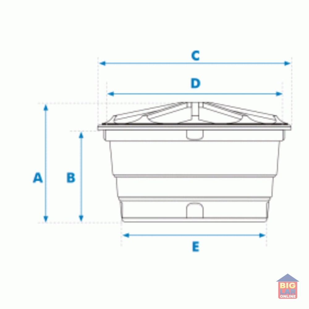 A - Altura com tampa 0,97m B - Altura sem tampa 0,76m C - Diâmetro com tampa 1,52m D - Diâmetro sem tampa 1,51m E - Diâmetro da base 1,16m