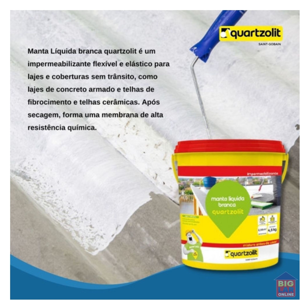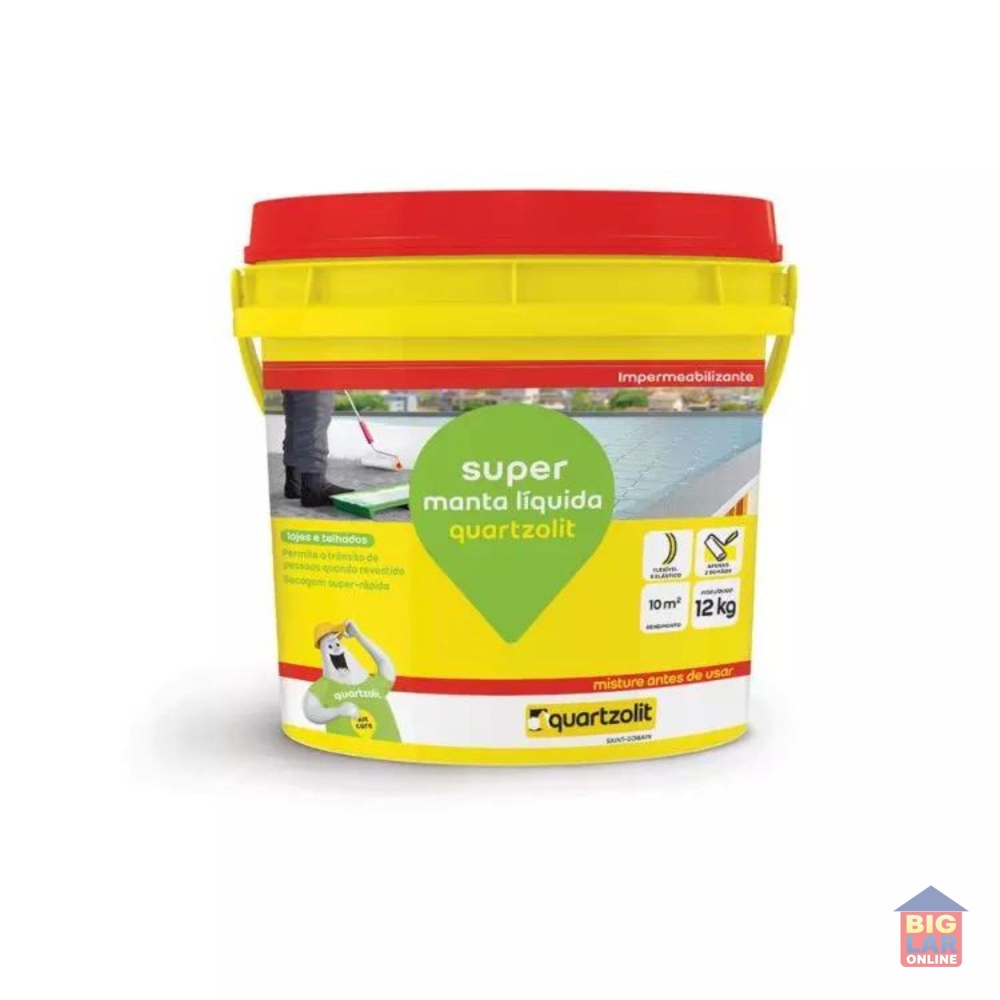 super manta líquida quartzolit é uma manta flexível para impermeabilizar coberturas com e sem trânsito, como lajes de concreto armado, telhas de fibrocimento, telhas cerâmicas e superfícies metálicas (telhas, rufos e pingadeiras de lata galvanizadas).
