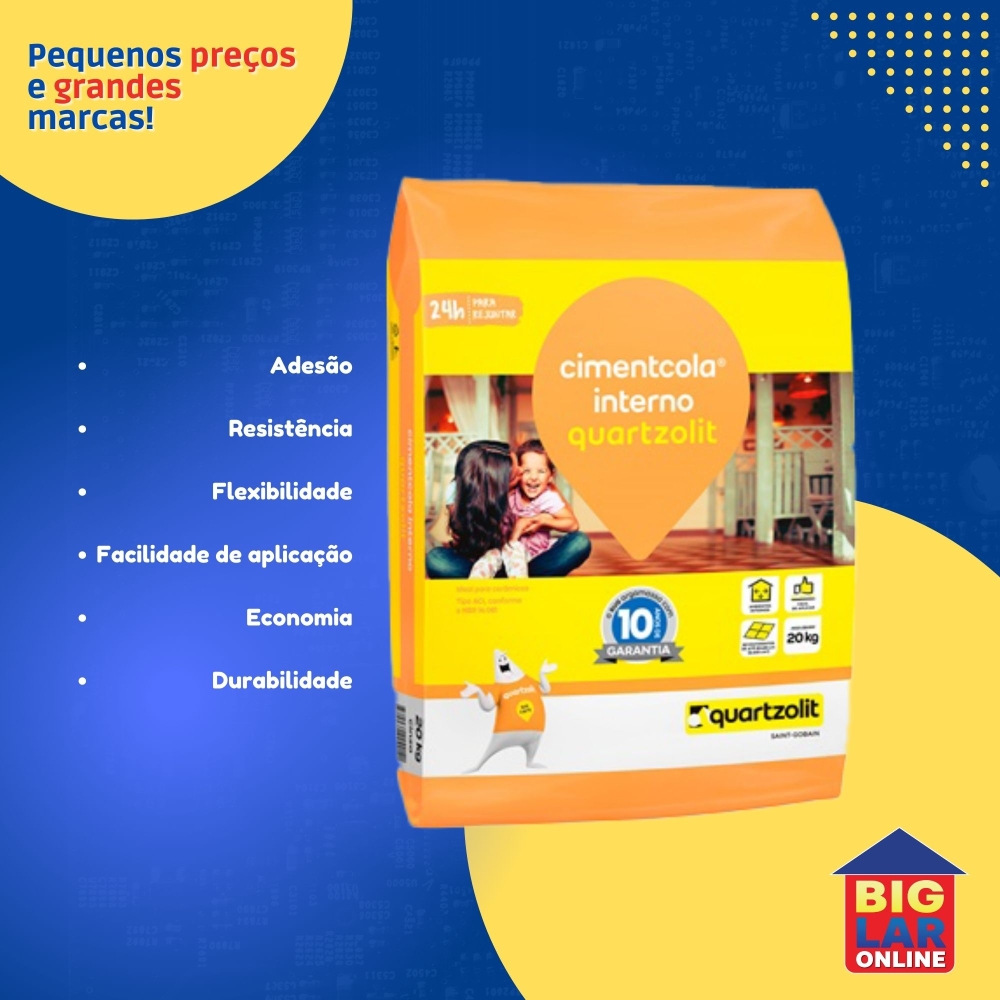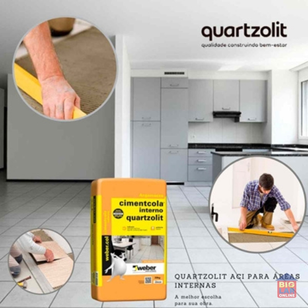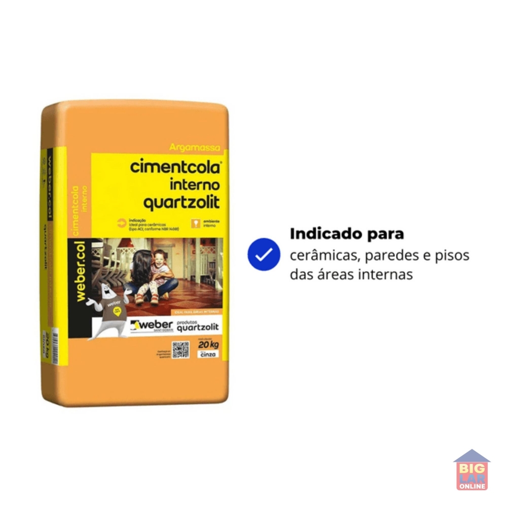 A Argamassa Colante Cimentcola Interno Cinza 20kg da Quartzolit é um produto tipo ACI, ideal para assentar cerâmicas até 60x60cm em áreas internas. Produto não indicado piscinas, saunas, churrasqueiras, lareiras, frigoríficos e bases com pinturas ou qualquer substância que possa impedir a boa aderência da argamassa.