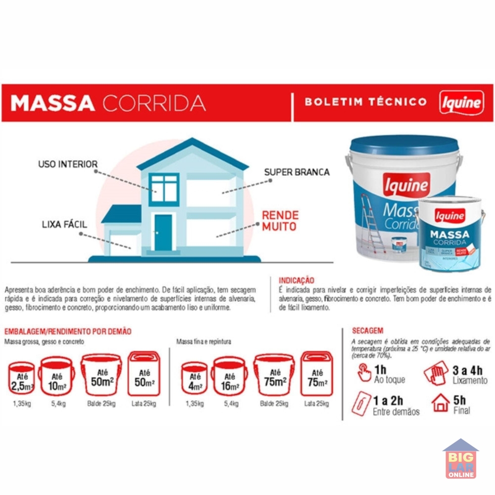 Massa Corrida Iquine à base de emulsão copolímera apresenta boa aderência e bom poder de enchimento. De fácil aplicação, tem secagem rápida e é indicada para correção e nivelamento de superfícies internas de alvenaria, gesso, fibrocimento e concreto, proporcionando um acabamento liso e uniforme.