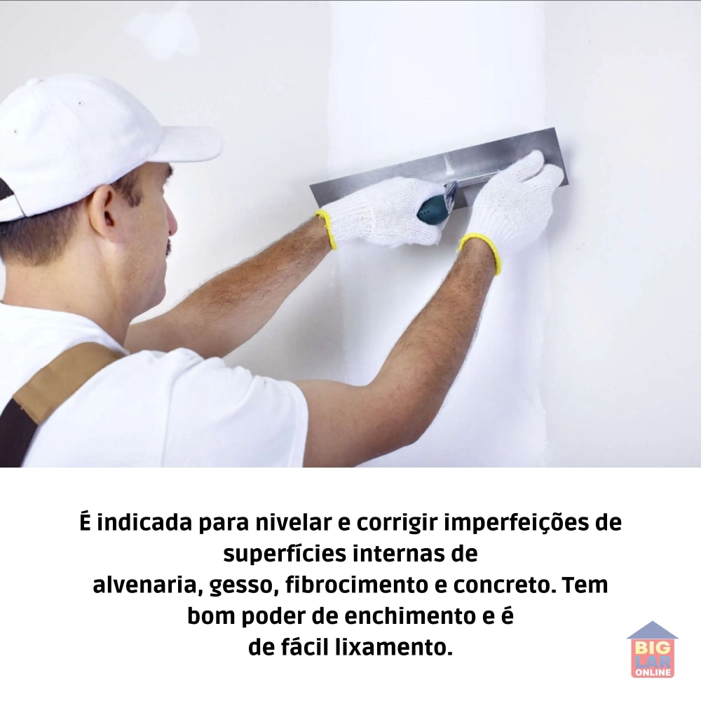 É indicada para nivelar e corrigir imperfeições de superfícies internas de alvenaria, gesso, fibrocimento e concreto. Tem bom poder de enchimento e é de fácil lixamento.