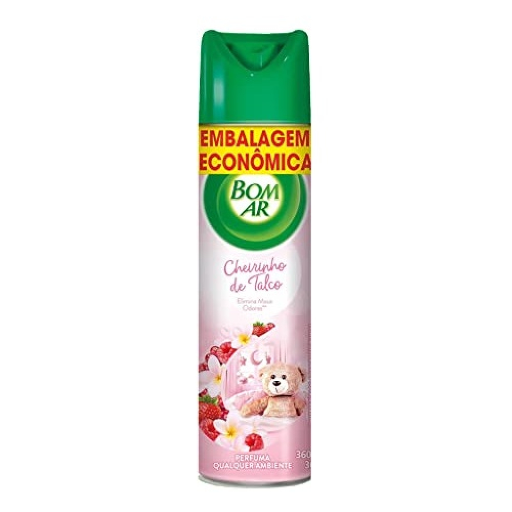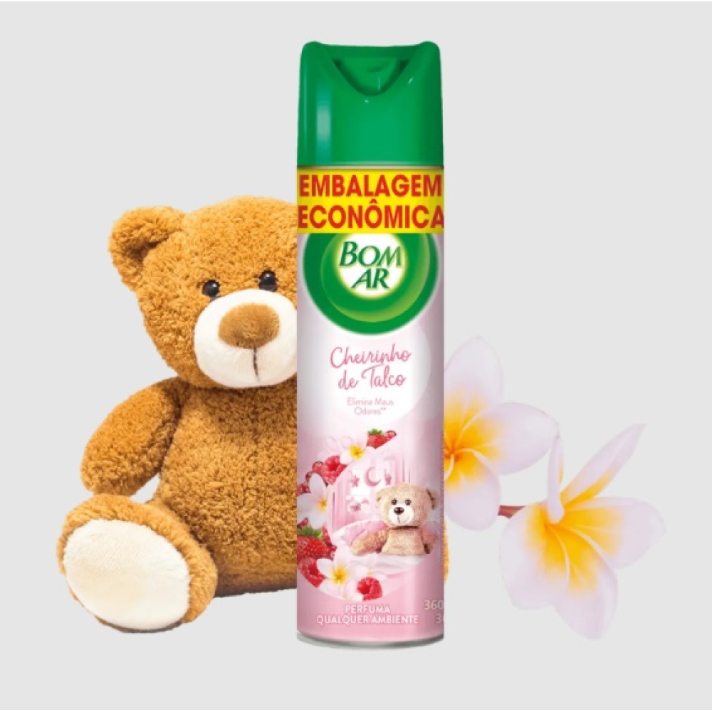 Cherinho de talco tem tudo a ver com cuidado, não é? A fórmula do Bom Ar® Cheirinho de Talco elimina o odores desagradáveis do ambiente, mantém o ar fresco e traz delicadeza para o ambiente.