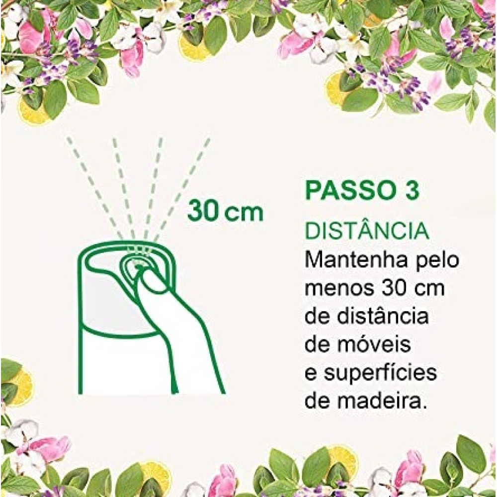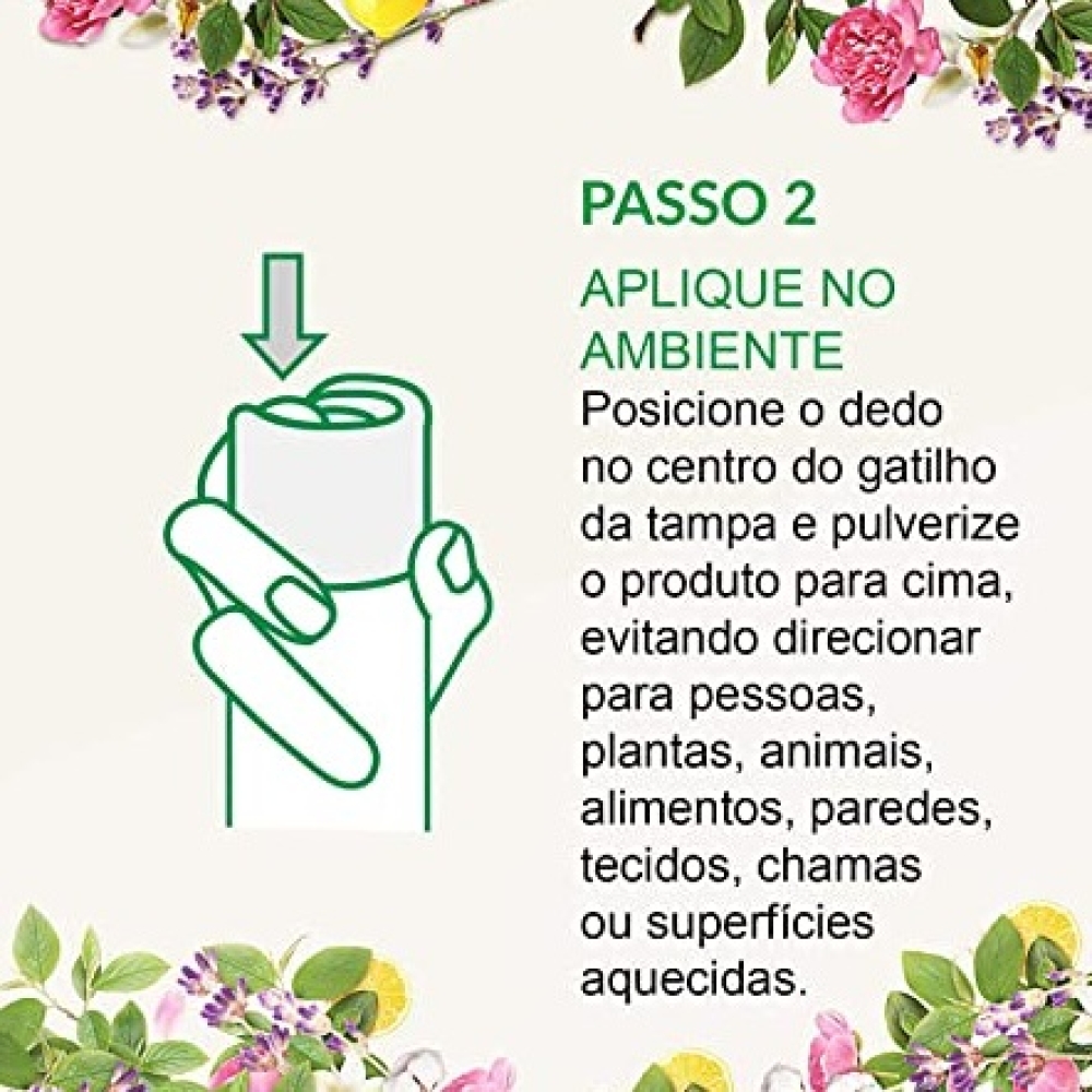 2. APLIQUE NO AMBIENTE: posicione o dedo no centro do gatilho da tampa e pulverize o produto para cima, evitando direcionar sobre pessoas, plantas, animais, alimentos, paredes, tecidos, chamas ou superfícies aquecidas.