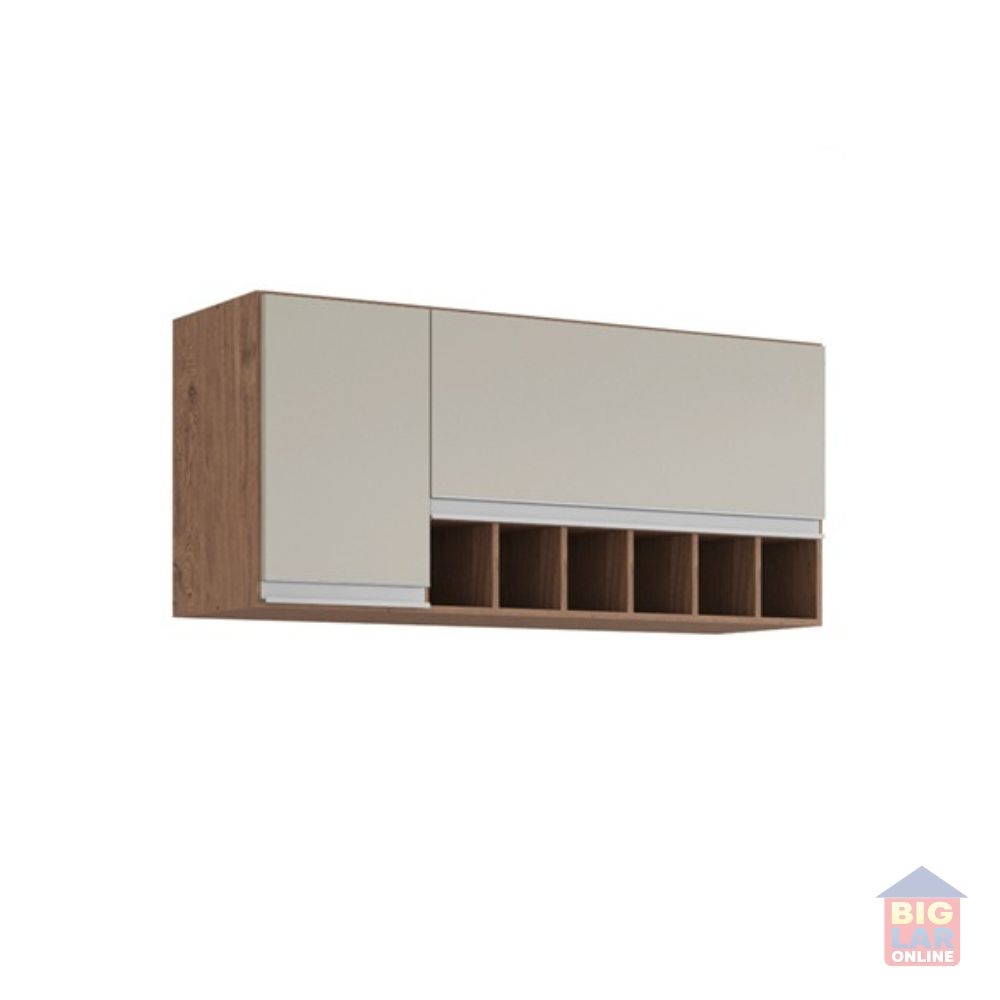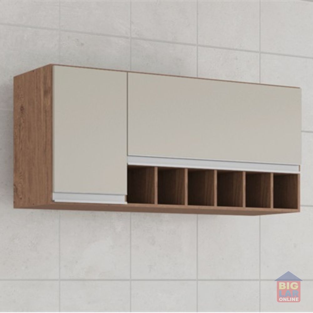 O Armário Aéreo para Cozinha da linha Prisma da MGM Móveis possui estrutura 100% MDF na cor Amêndoa e Off White, tem tamanho de 50x114cm e profundidade de 31,8cm. Indicado para cozinha, área gourmet ou área de serviço, conta com 2 portas, sendo 1 com pistão à gás, 6 nichos, puxadores em perfil alumínio com amplo espaço interno.