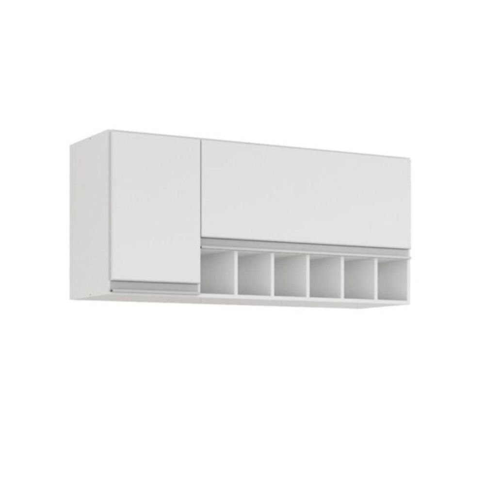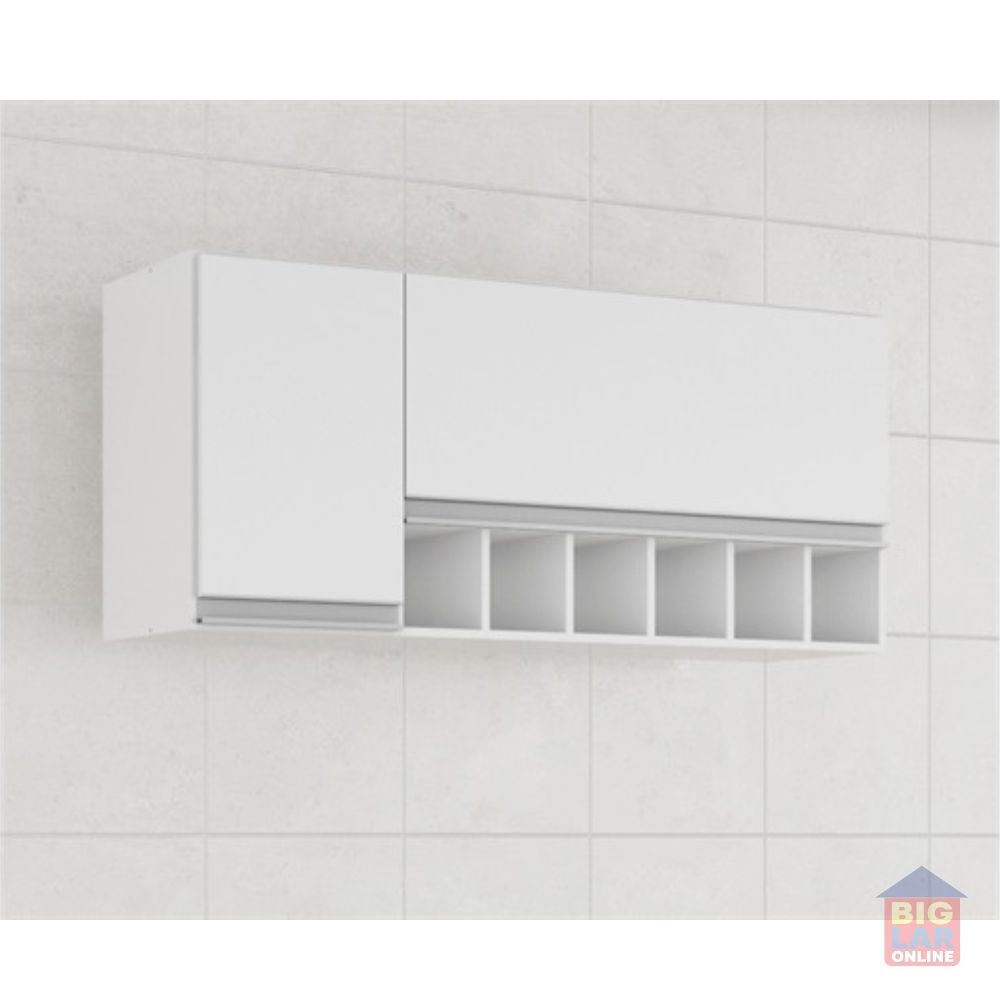 O Armário Aéreo para Cozinha da linha Prisma da MGM Móveis possui estrutura 100% MDF na cor Branca, tem tamanho de 50x114cm e profundidade de 31,8cm. Indicado para cozinha, área gourmet ou área de serviço, conta com 2 portas, sendo 1 com pistão à gás, 6 nichos, puxadores em perfil alumínio com amplo espaço interno.