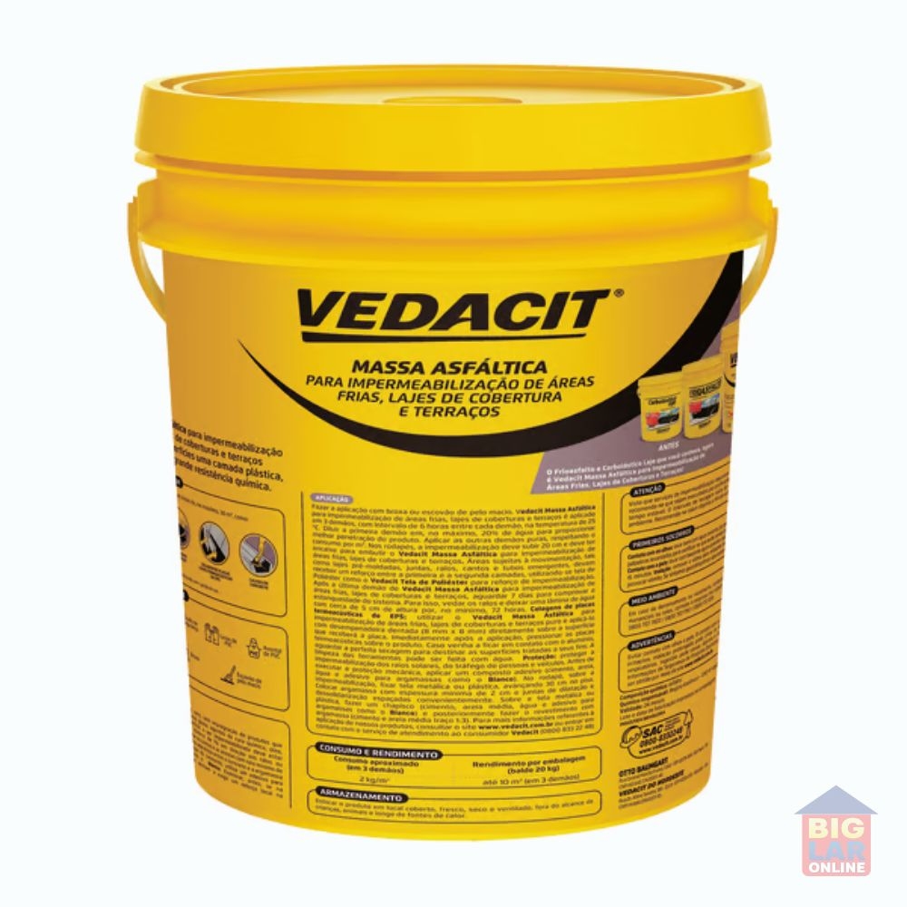 Impermeabilizante 20 kg Vedacit Consiste em uma massa betuminosa que forma uma camada impermeável. Tem grande resistência química e a aplicação é a frio. O produto vem pronto para uso e é moldado no local. Ela é recomendada para áreas de até 30 m². Quanto ao rendimento, o balde de 20 l é capaz de cobrir uma área de 10 m². Devem ser aplicadas no mínimo 3 demãos, com intervalo de pelo menos 6 horas entre cada uma delas. A secagem total do produto é de 168 h (7 dias), mas pode apresentar variação de acordo com a temperatura, ventilação e umidade do ambiente.