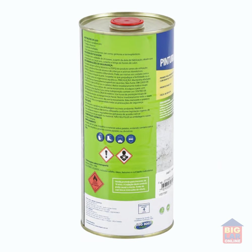 Uso Indicado: Primer para colagem de mantas asfálticas; Primer para impermeabilizações com soluções asfálticas moldadas no local; Primer para selantes asfálticos; Proteção anticorrosiva em metais; Pintura impermeável em baldrames, alicerces e muros de arrimo; Pintura impermeável para fachadas, quando for aplicada sob película de vidro; Forma eficiente barreira contra a umidade, permitindo perfeito acabamento.