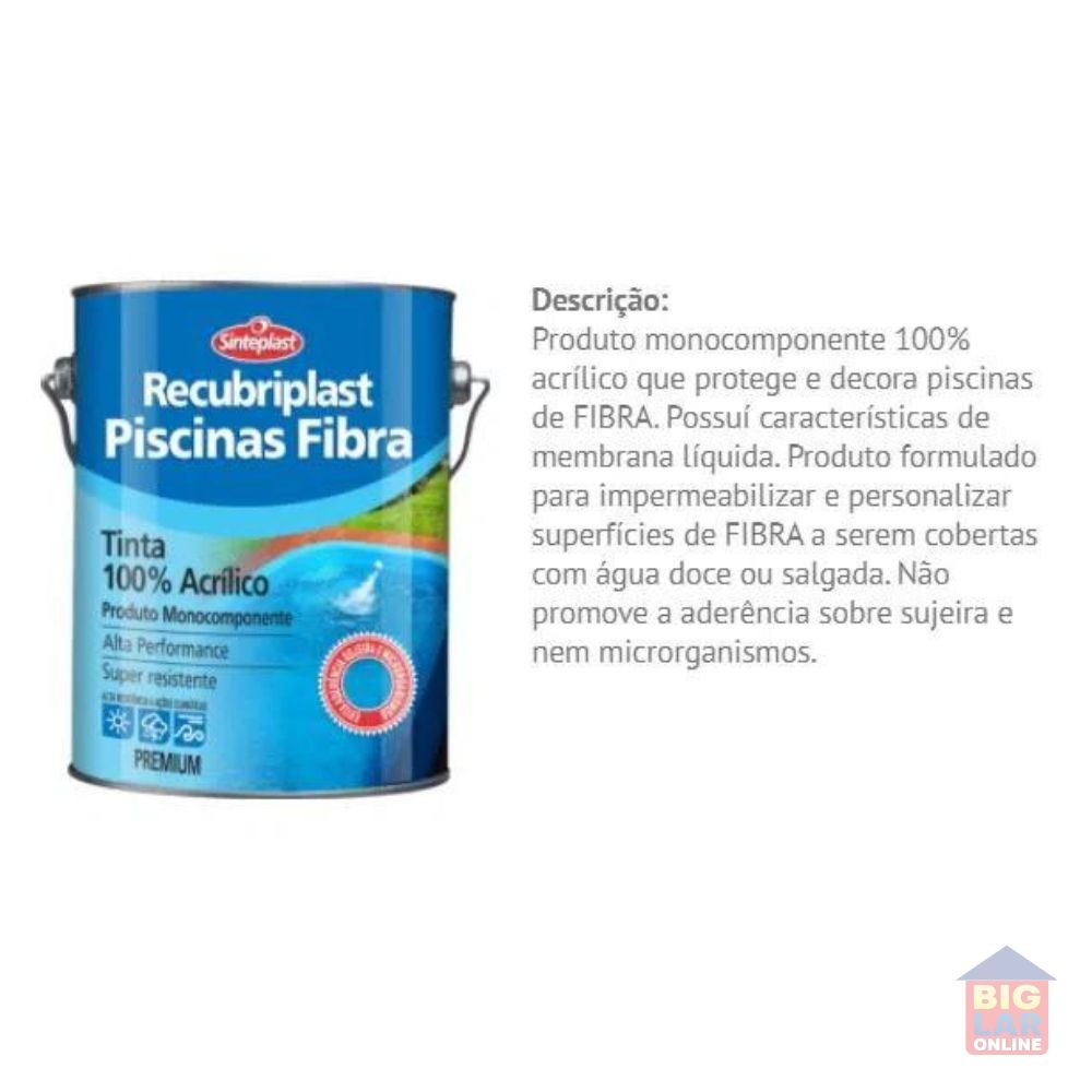 Produto monocomponente 100% acrílico que protege e decora piscinas de fibra. Possuí característica de membrana líquida. Aplicado na quantidade indicada e quando curado, forma uma película flexível, de elevada aderência, resistente aos raios UV, produtos químicos utilizados para o tratamento de água da piscina e as ações regulamentares de limpeza. Produto formulado para impermeabilizar e personalizar superfícies de fibra a serem cobertas com água doce ou salgada. Não promove a aderência de sujeira nem a fixação de microrganismos.