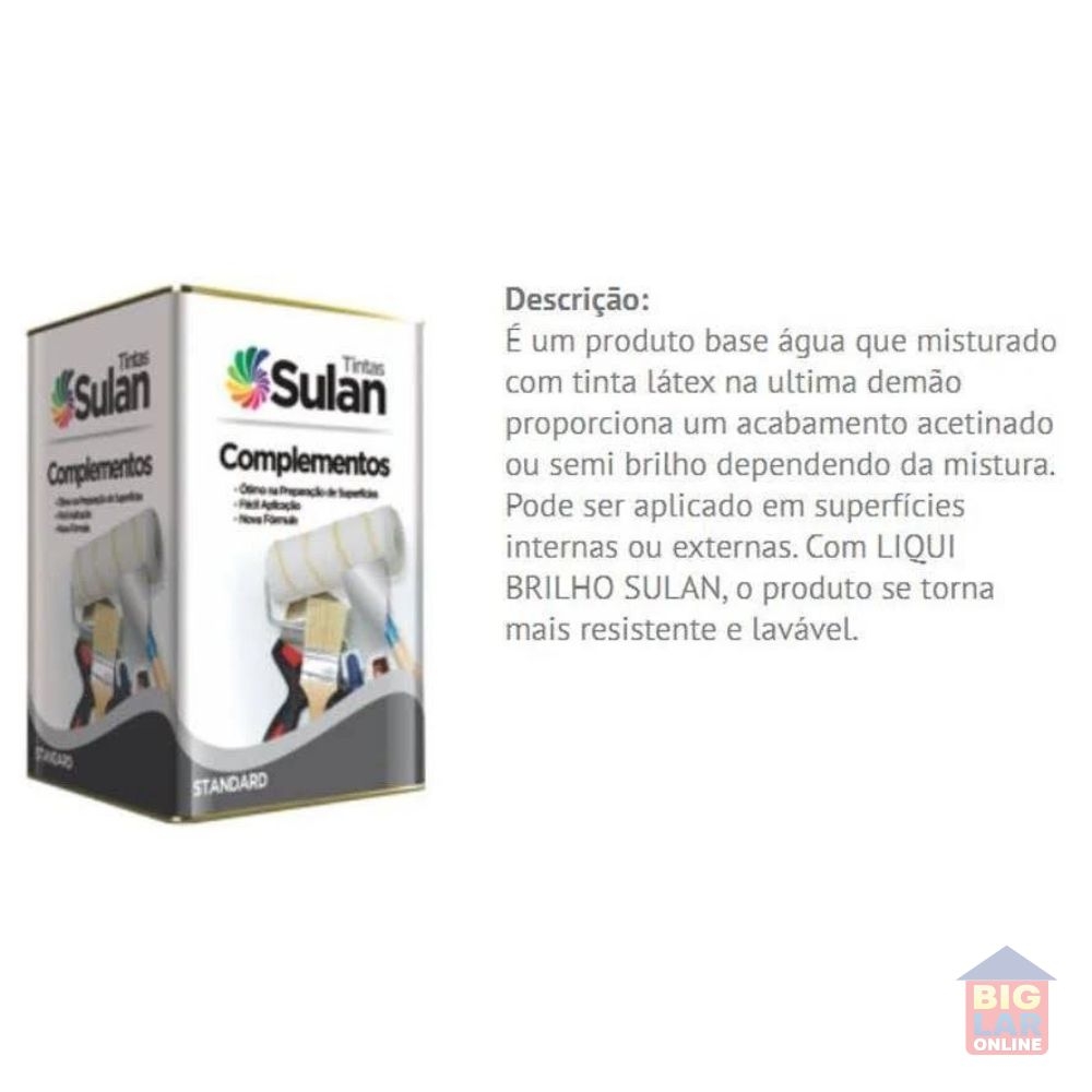 É um produto base água que misturado com tinta látex na última demão proporciona um acabamento acetinado ou semi brilho dependendo da mistura. Pode ser aplicado em superfícies internas ou externas. Com LIQUI BRILHO SULAN, o produto se torna mais resistente e lavável.