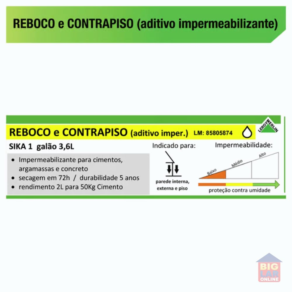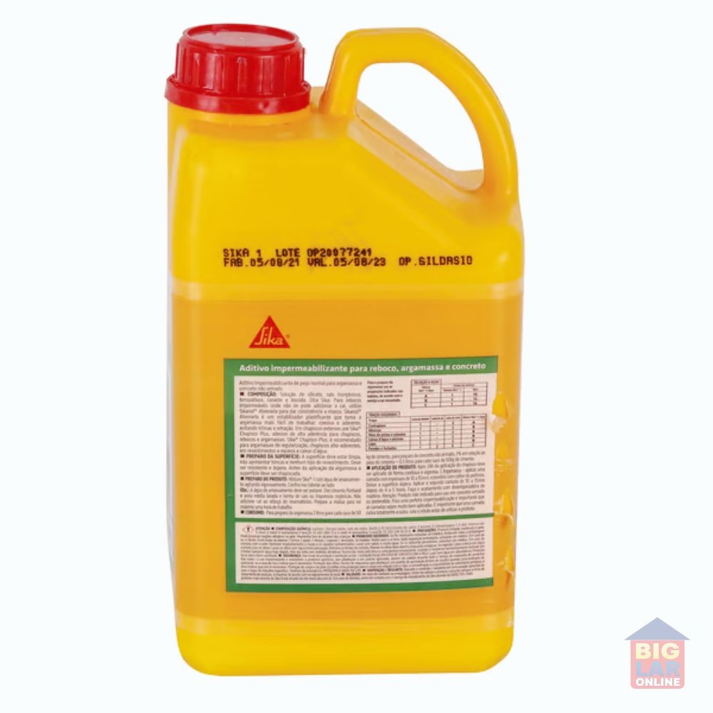 Impermeabilizante Sika 1 3,6L Sika O produto da marca Sika é vendido em galões com 3,6 litros cada. Ele deve ser misturado juntamente com o cimento durante a preparação deste último para a sua aplicação em conjunto. Não se usa o aditivo diretamente na parede, apenas misturando desta forma.