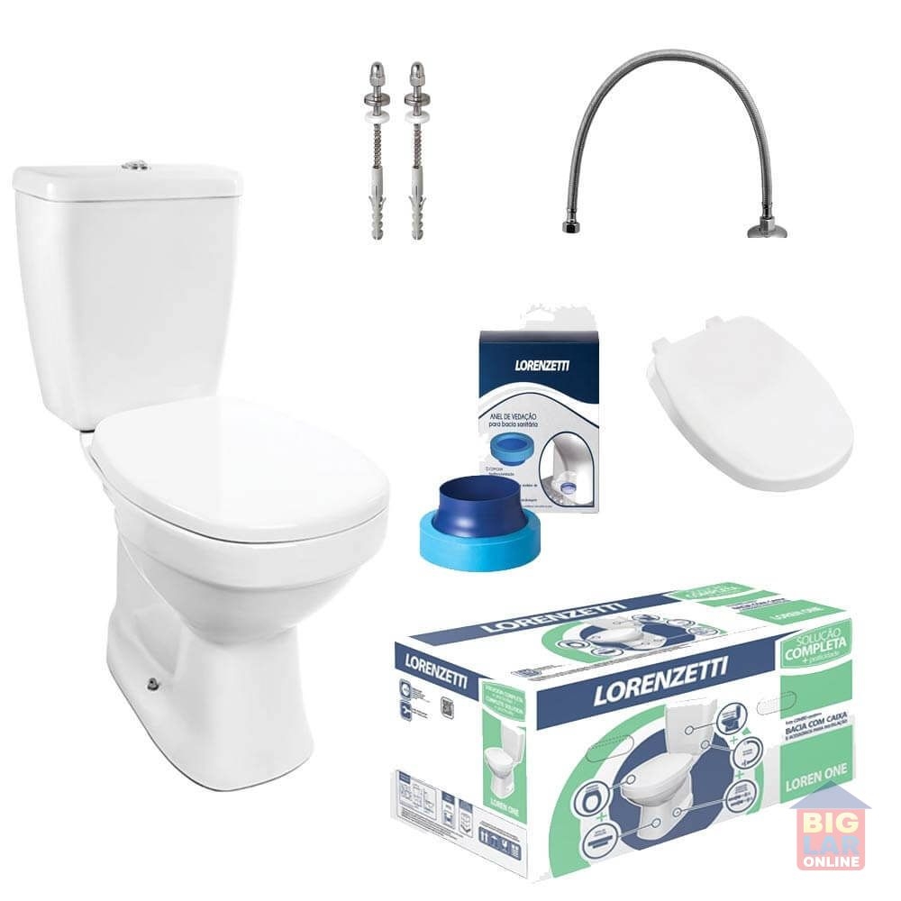 O Kit Vaso Sanitário com Caixa Acoplada LorenOne Branco da Lorenzetti é produzido em cerâmica sanitária com design arredondado e sifão oculto. Acompanha caixa acoplada duo flow, assento em polipropileno, anel para vedação, flexível em inox e parafusos para fixação.