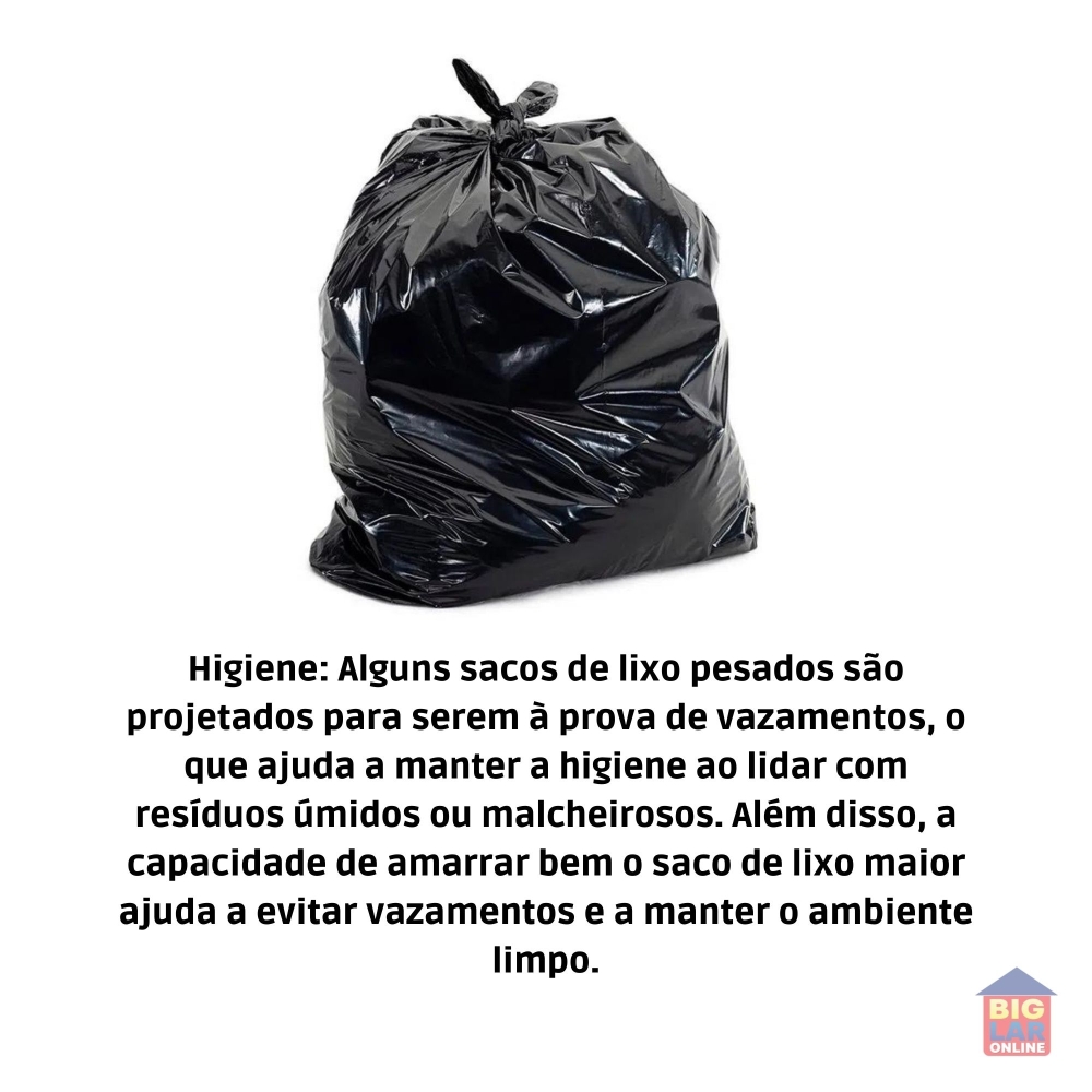 Higiene: Alguns sacos de lixo pesados são projetados para serem à prova de vazamentos, o que ajuda a manter a higiene ao lidar com resíduos úmidos ou malcheirosos. Além disso, a capacidade de amarrar bem o saco de lixo maior ajuda a evitar vazamentos e a manter o ambiente limpo.
