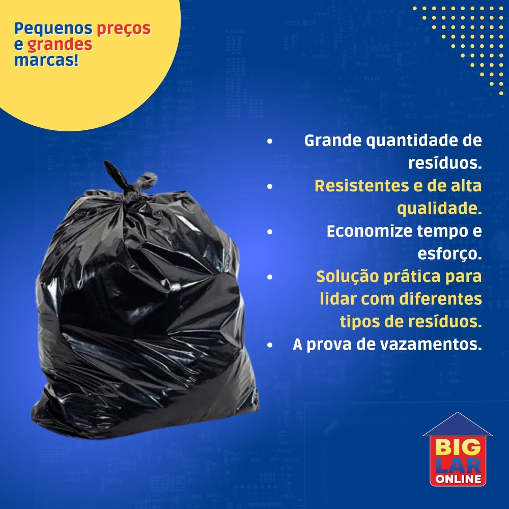 Versatilidade: O tamanho maior do saco de lixo permite que você o utilize em várias situações, como limpeza de quintais, descarte de objetos volumosos ou embalagem de doações. Ele oferece uma solução prática para lidar com diferentes tipos de resíduos.
