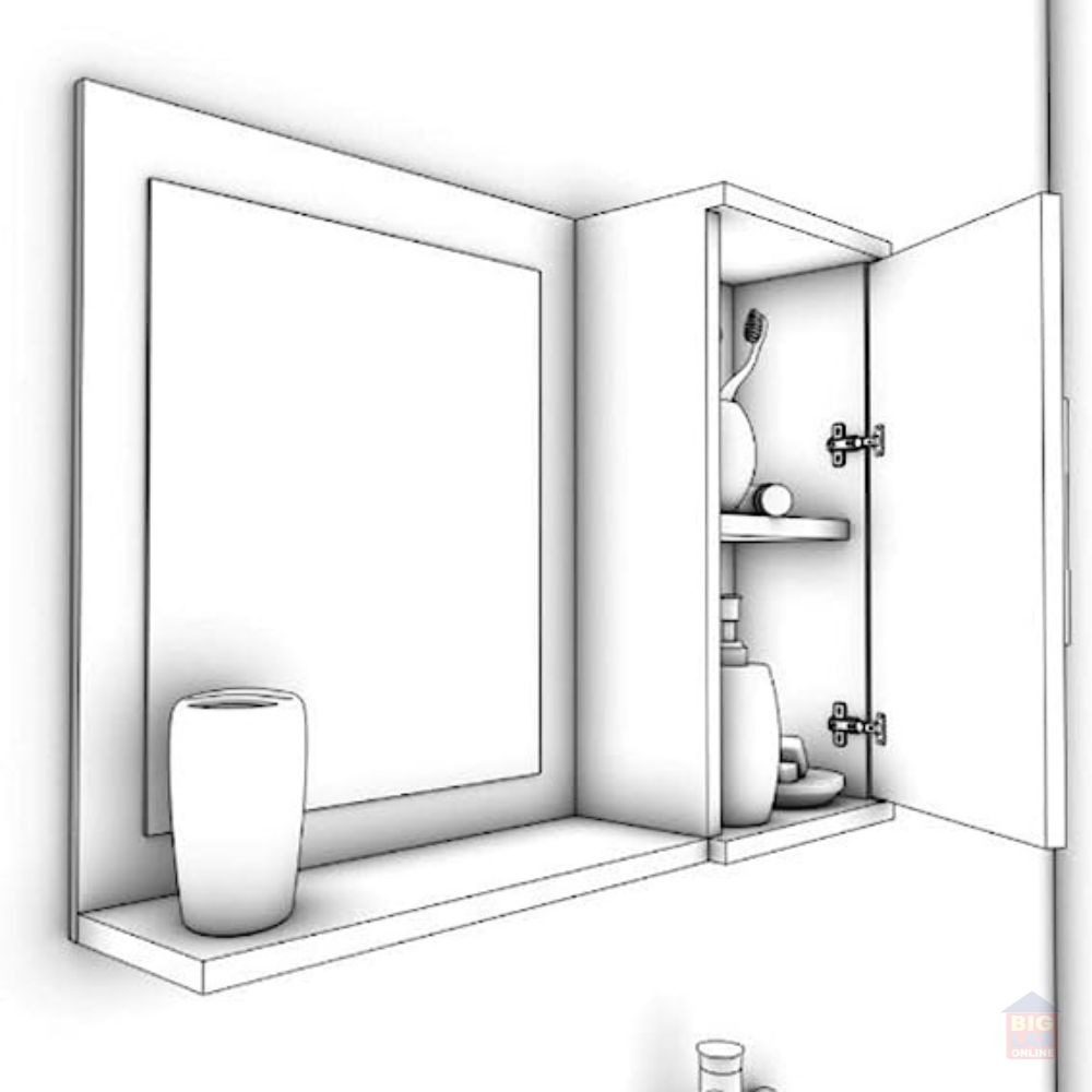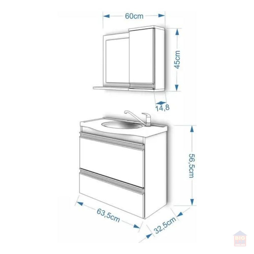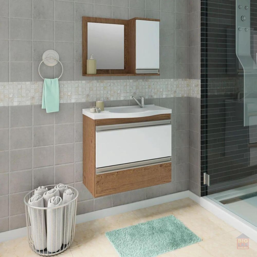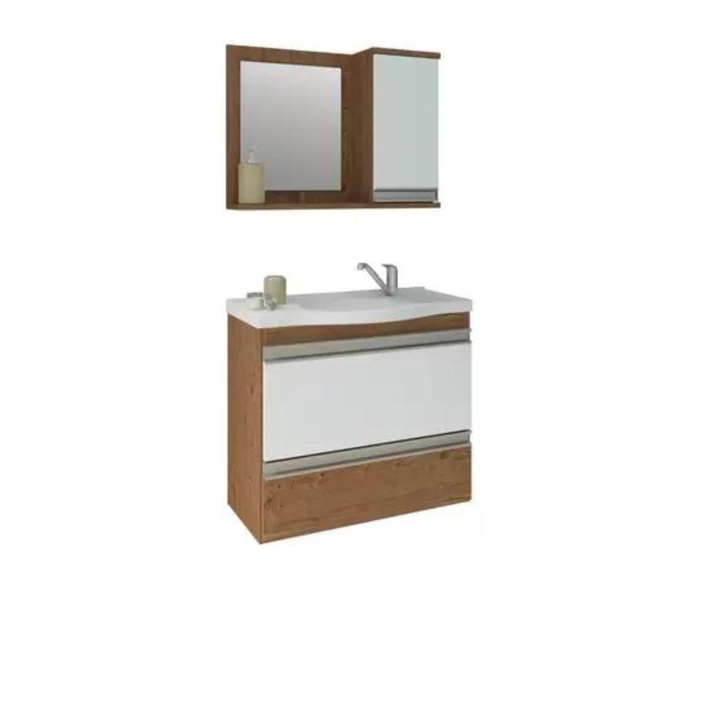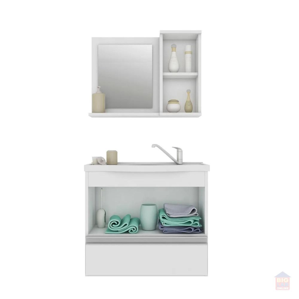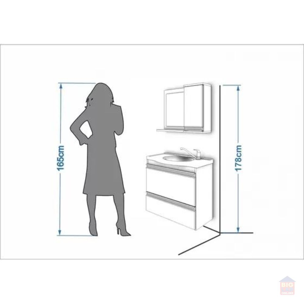 Diferenciais : Armário para banheiro suspenso com espelheira, uma porta basculante e abertura com pistão a gás, uma gaveta com corrediça telescópica, espelheira com uma porta e duas prateleiras, puxadores em perfil alumínio, estrutura MDF, amplo espaço interno, lavatório mármore sintético com mais durabilidade e resistência.