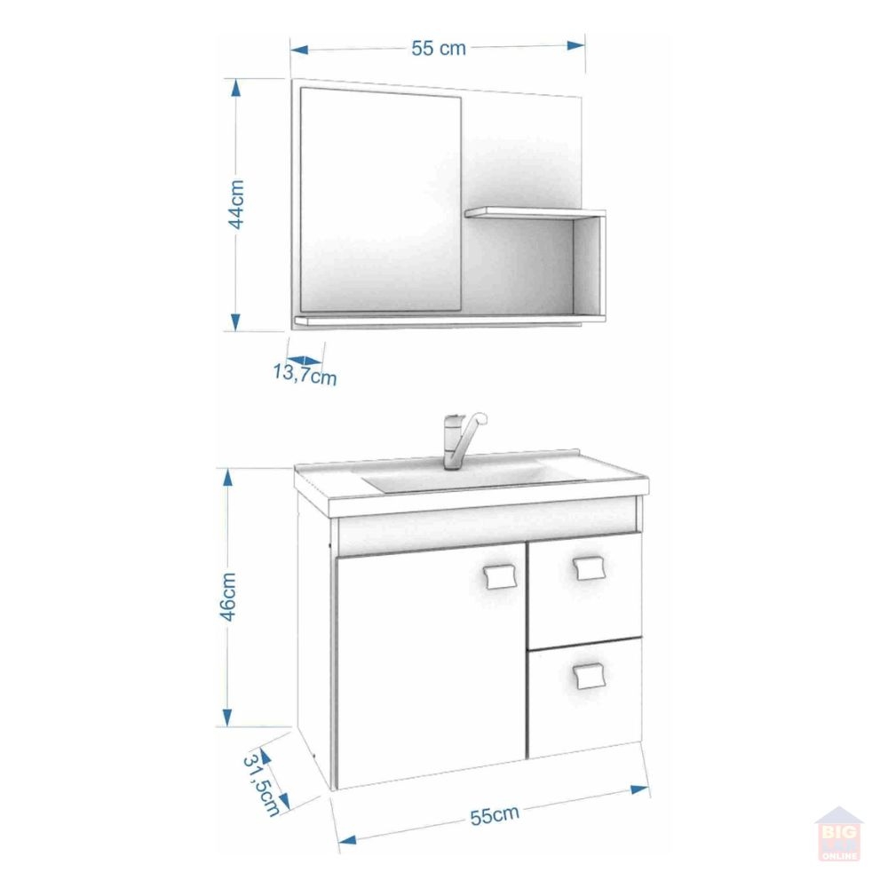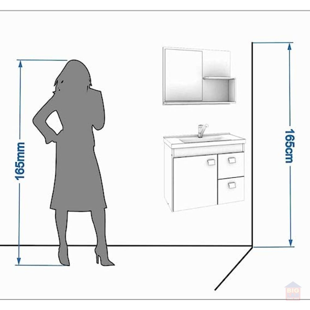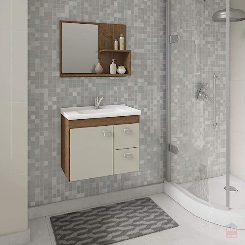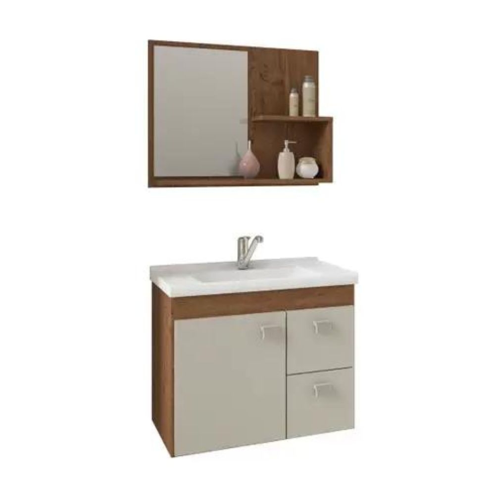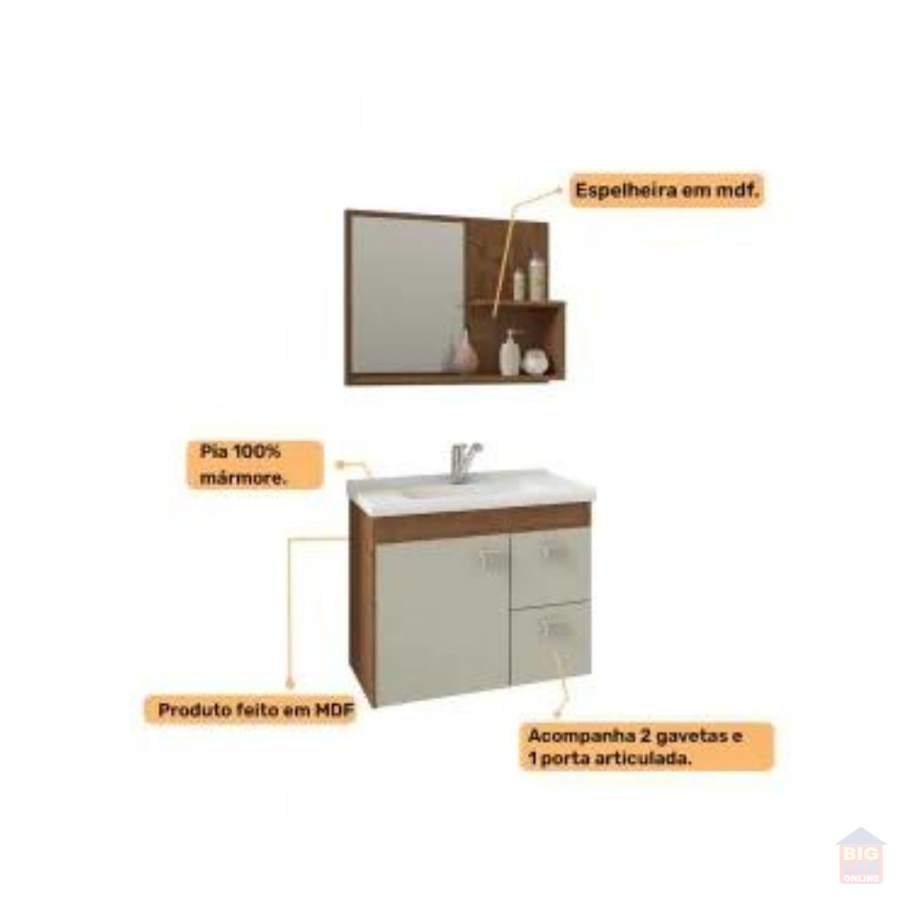 Possui uma porta, duas gavetas com corrediças telescópicas, espelheira com duas prateleiras, puxadores em ABS, com amplo espaço interno e lavatório 100% mármore sintético com mais durabilidade e resistência.