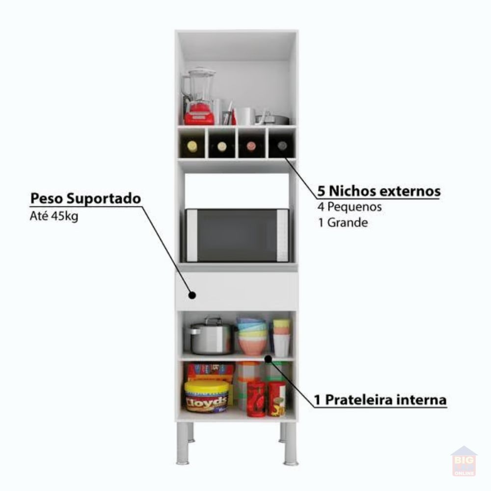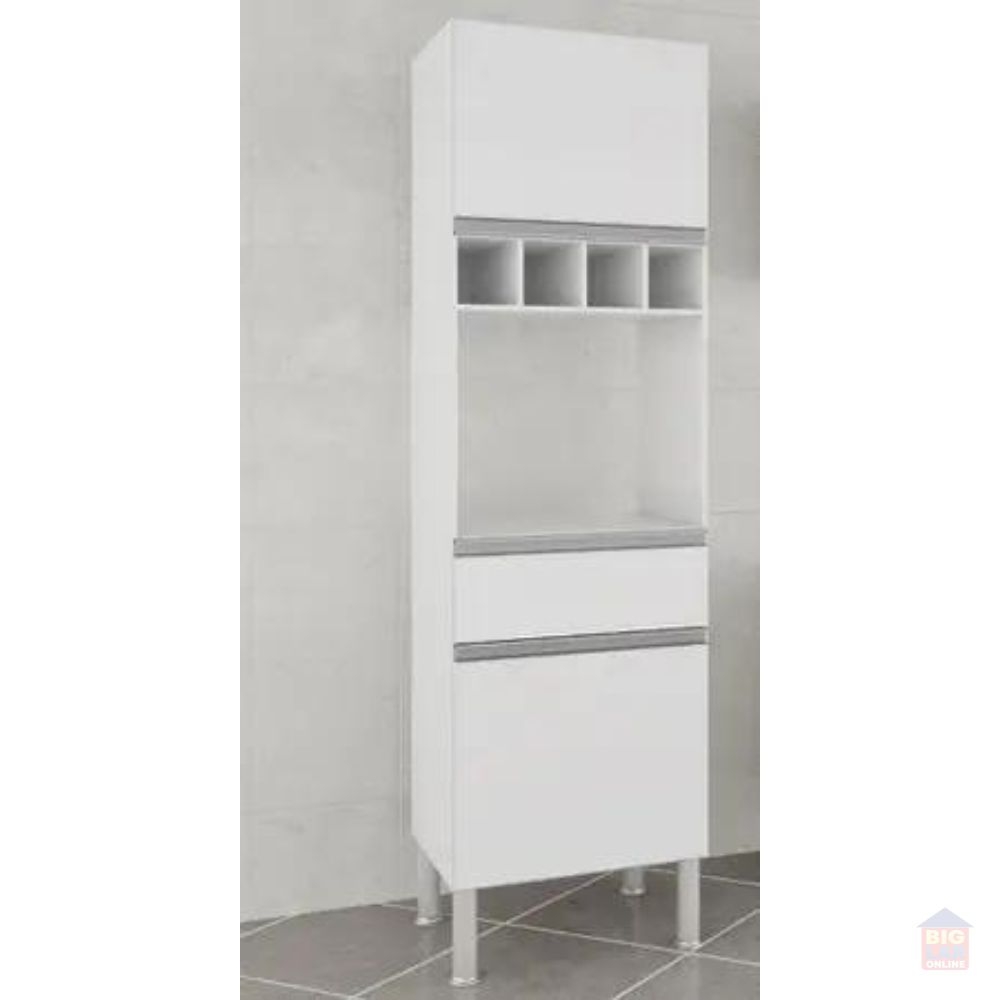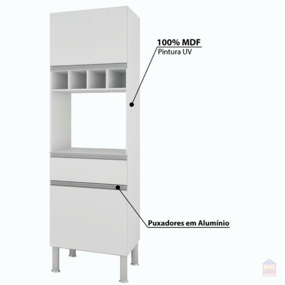 O Paneleiro Prisma 202x56,5cm Branco da MGM Móveis possui estrutura 100% MDF na cor Branca, tem tamanho de 202x56,5cm e profundidade de 51,5cm. Indicado para cozinha, área gourmet ou área de serviço, conta com 2 portas, sendo 1 com pistão à gás, 1 gaveta com corrediça telescópica, 4 nichos, espaço para micro-ondas ou forno elétrico, puxadores em perfil alumínio com amplo espaço interno.