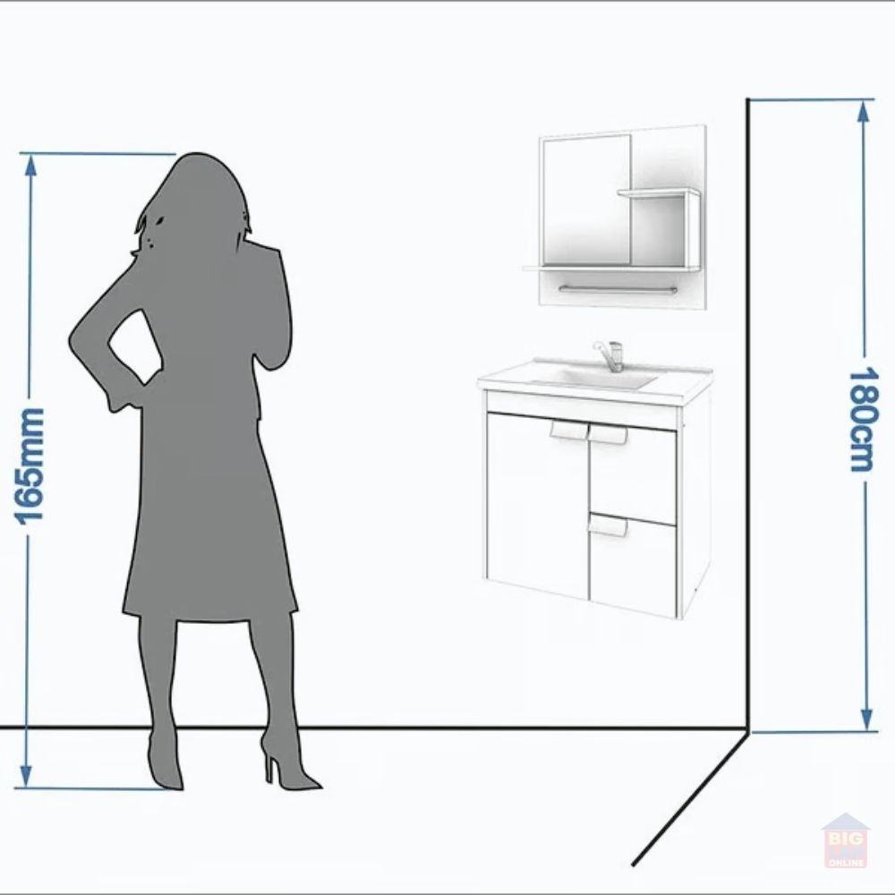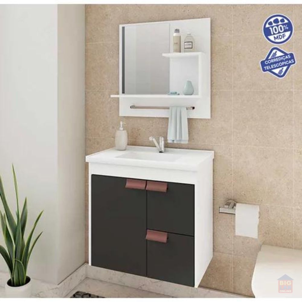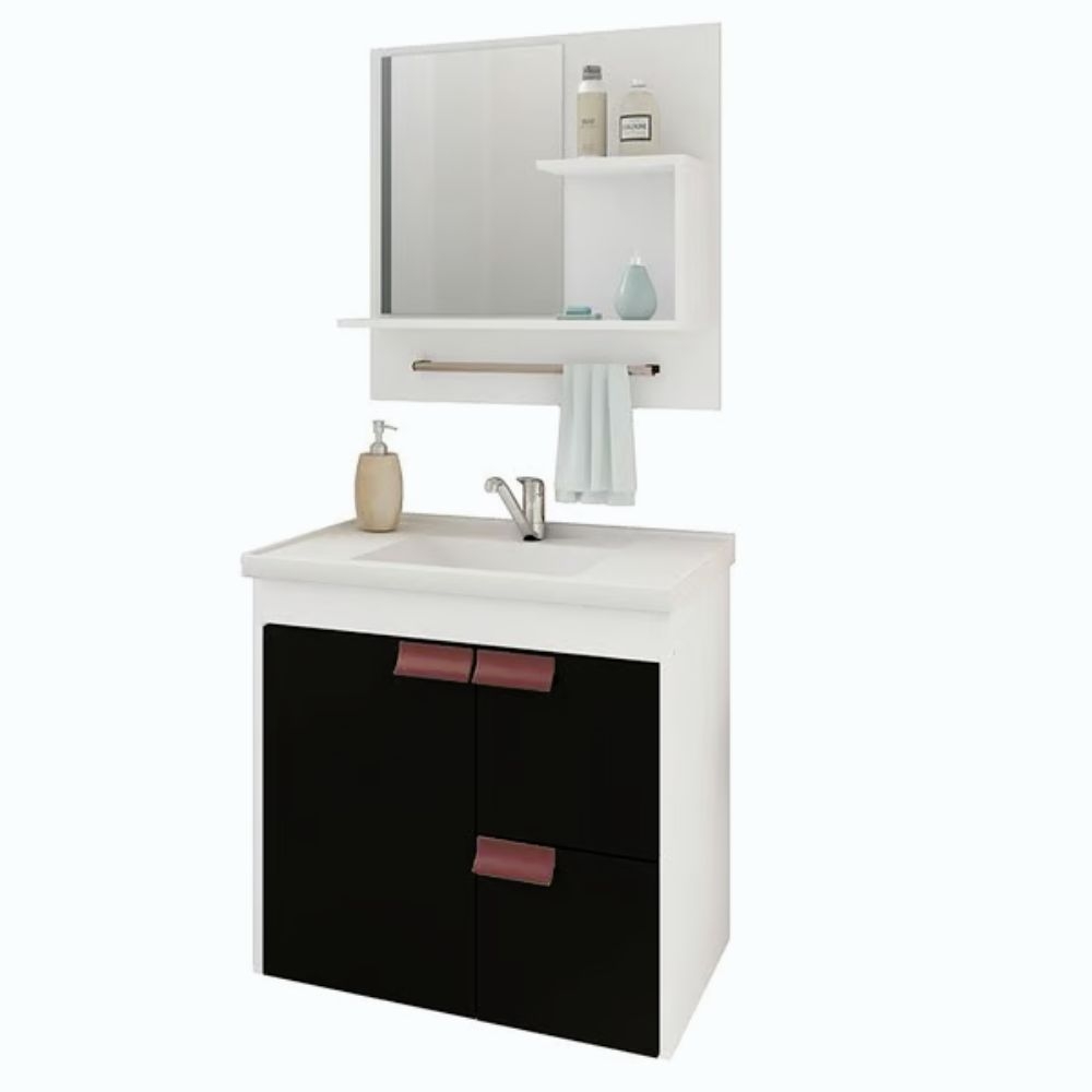 O Gabinete Suspenso para Banheiro da linha Tulipa da MGM Móveis possui estrutura 100% MDF na cor Branca e Preto, tem tamanho de 56x59cm e profundidade de 35,5cm. Possui uma porta e duas gavetas com corrediças telescópicas, espelheira com duas prateleiras e toalheiro em alumínio, puxadores em ABS, com amplo espaço interno, lavatório 100% mármore sintético com mais durabilidade e resistência.
