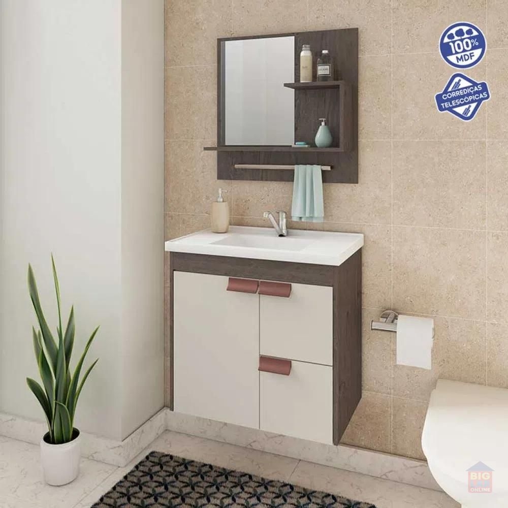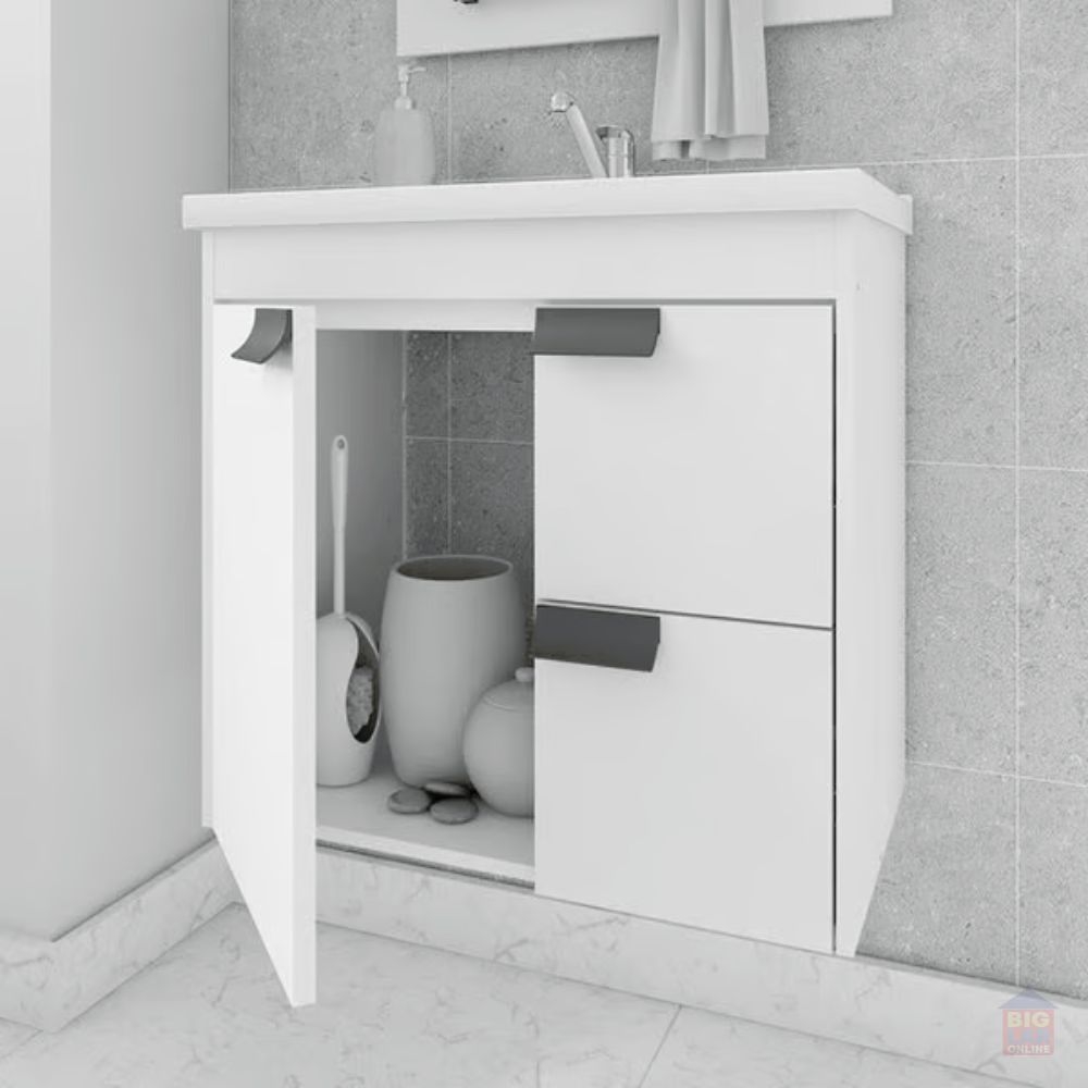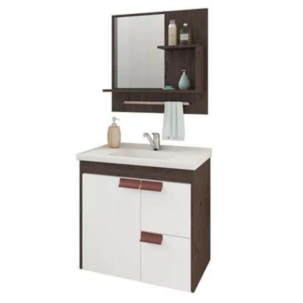 O Gabinete Suspenso para Banheiro da linha Tulipa da MGM Móveis possui estrutura 100% MDF na cor Café e Branco, tem tamanho de 56x59cm e profundidade de 35,5cm. Possui uma porta e duas gavetas com corrediças telescópicas, espelheira com duas prateleiras e toalheiro em alumínio, puxadores em ABS, com amplo espaço interno, lavatório 100% mármore sintético com mais durabilidade e resistência.