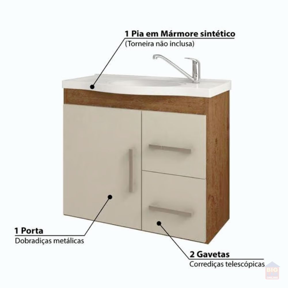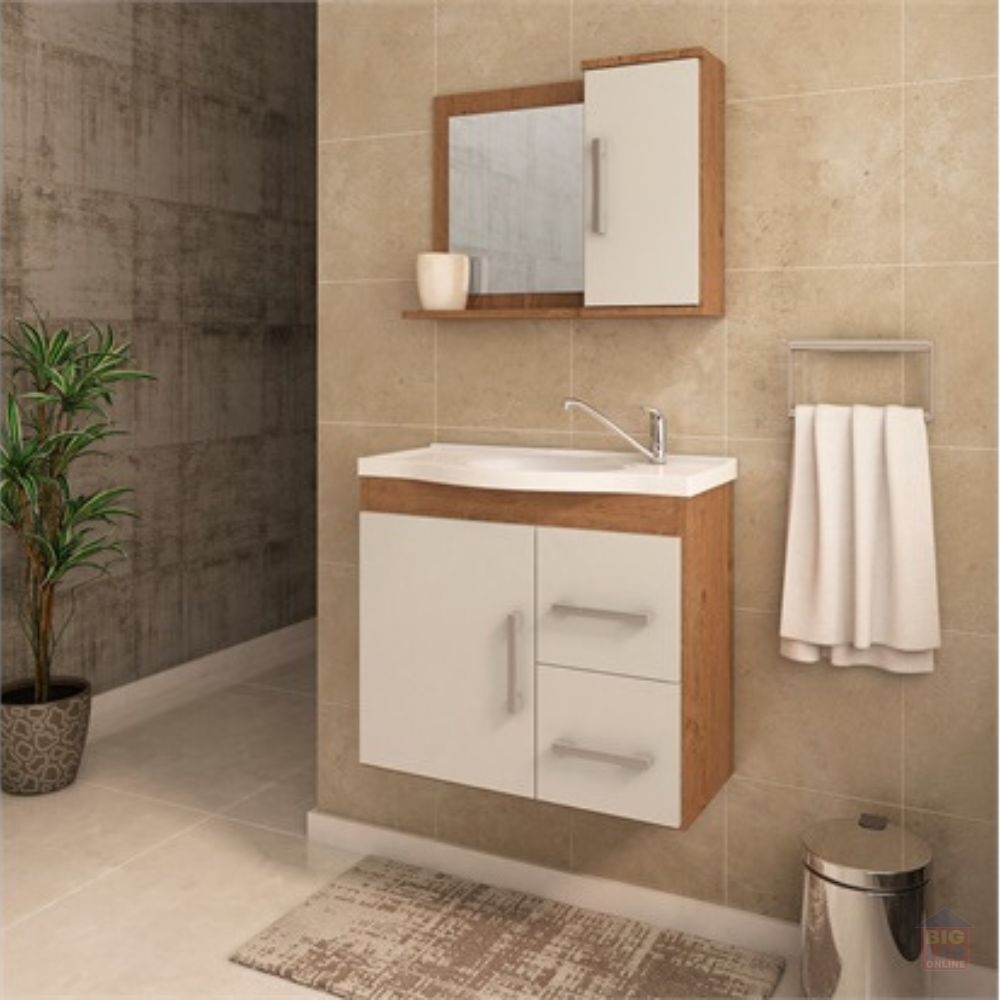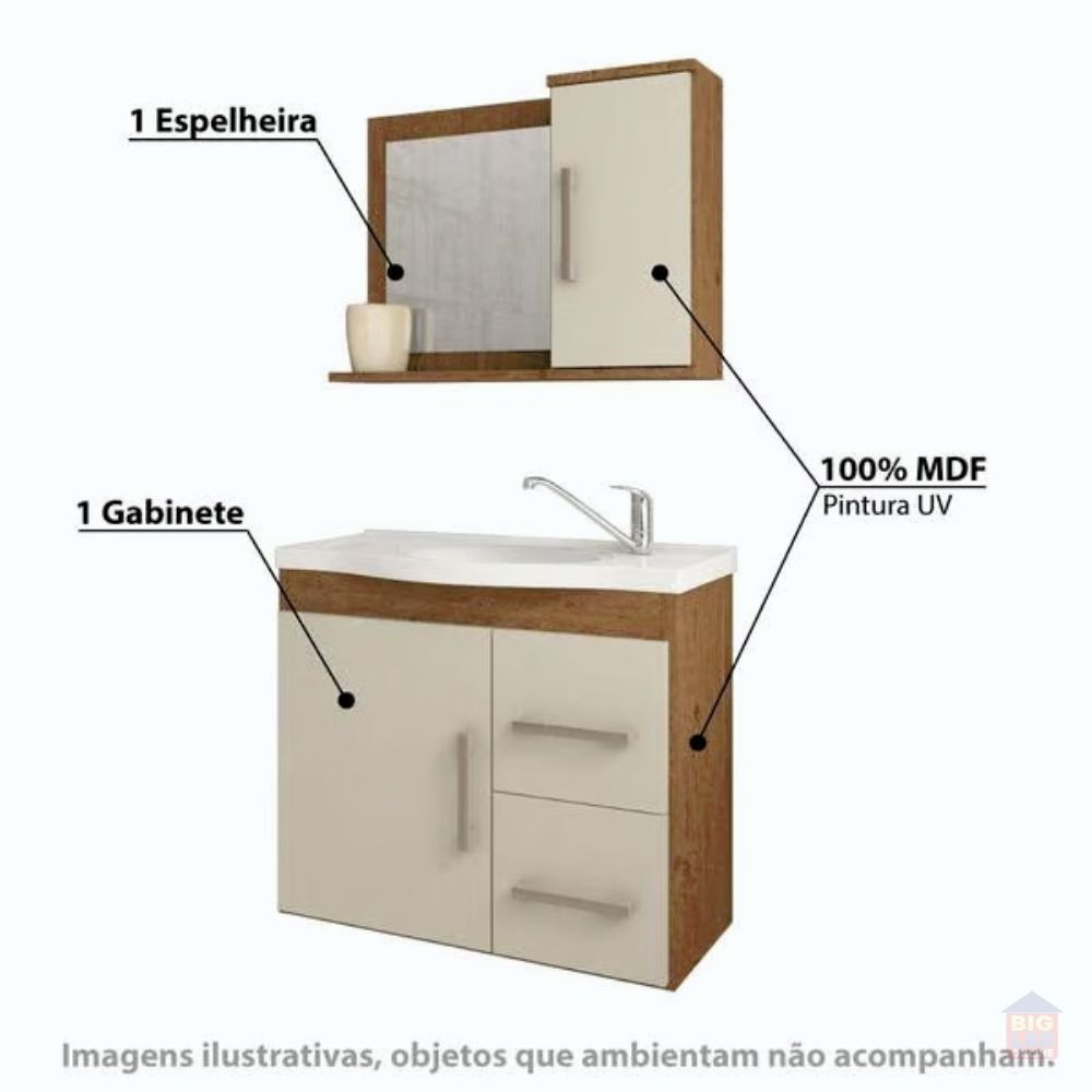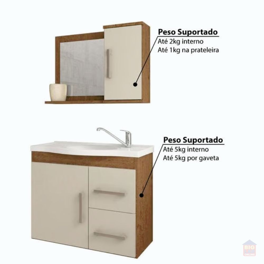 O Gabinete Suspenso para Banheiro da linha Vix da MGM Móveis possui estrutura 100% MDF na cor Amêndoa e Off White, tem tamanho de 56,5x63,5cm e profundidade de 32,5cm. Possui uma porta e duas gavetas com corrediças telescópicas, uma prateleira, espelheira com uma porta e duas prateleiras, puxadores em ABS, com amplo espaço interno e lavatório 100% mármore sintético com mais durabilidade e resistência.
