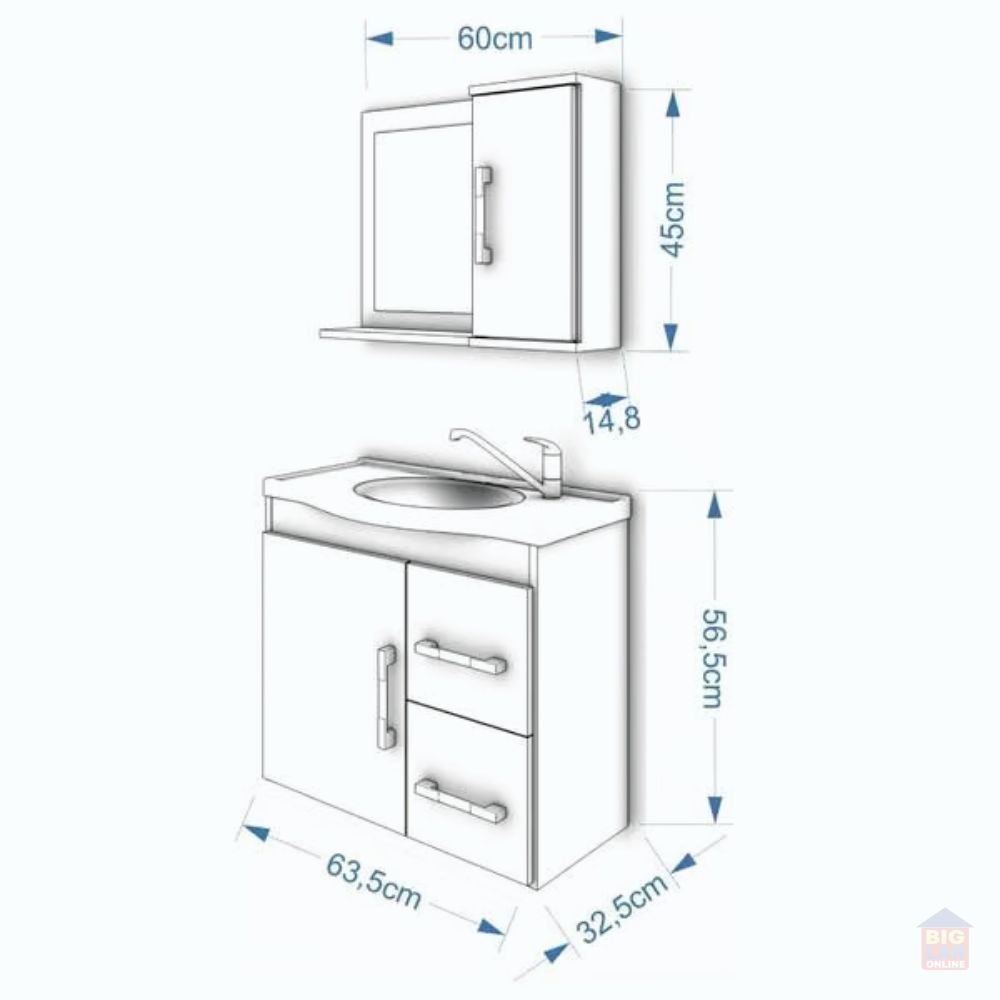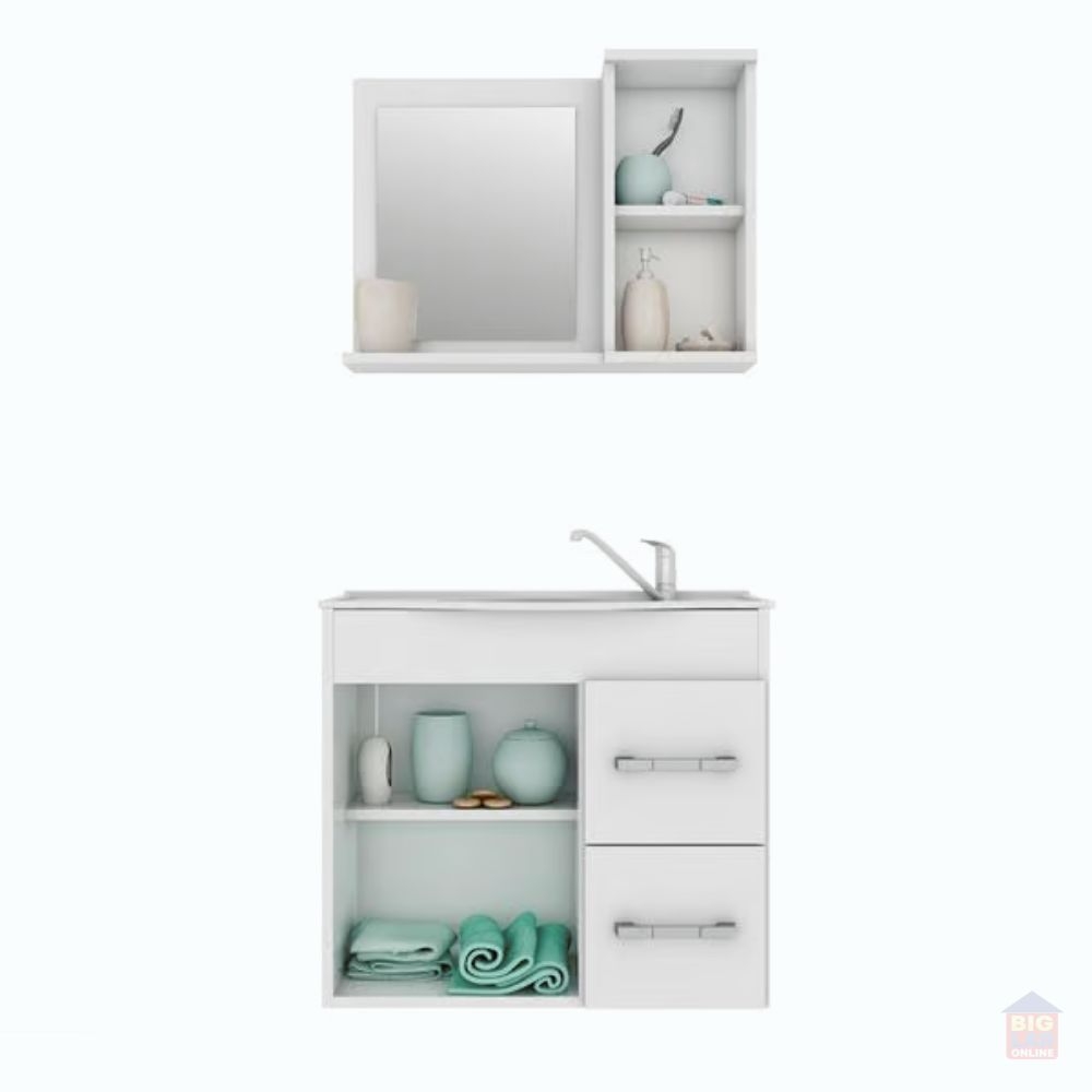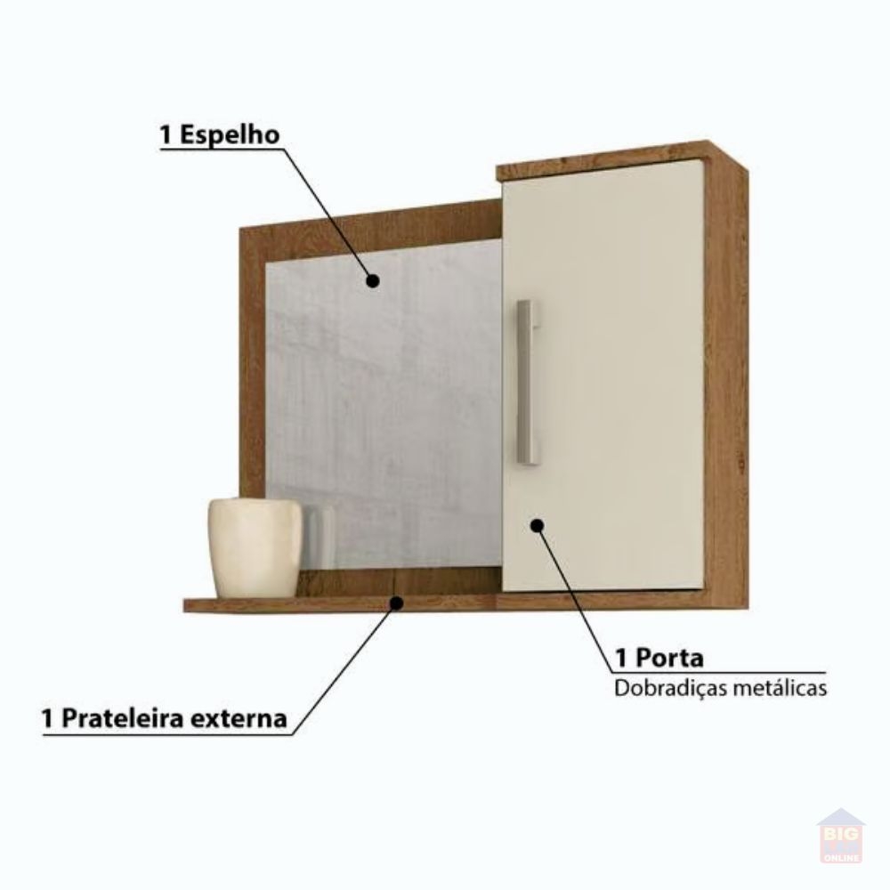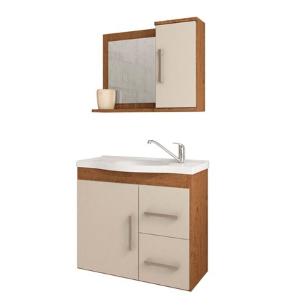 O Gabinete Suspenso para Banheiro da linha Vix da MGM Móveis possui estrutura 100% MDF na cor Amêndoa e Off White, tem tamanho de 56,5x63,5cm e profundidade de 32,5cm. Possui uma porta e duas gavetas com corrediças telescópicas, uma prateleira, espelheira com uma porta e duas prateleiras, puxadores em ABS, com amplo espaço interno e lavatório 100% mármore sintético com mais durabilidade e resistência.