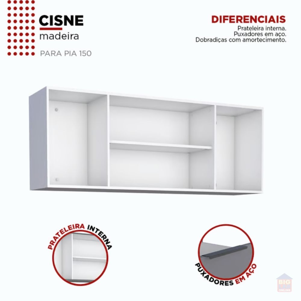 O Armário Aéreo para Cozinha Cisne em Madeira 144cm Cinza da Cozimax é elegante e sofisticado. É fabricado com chapas de madeira e acabamento em três versões de cores foscas em todo exterior, além de apresentar prateleira, divisão interna para organizar utensílios, puxadores exclusivos em estilo minimalista e dobradiças com amortecimento.