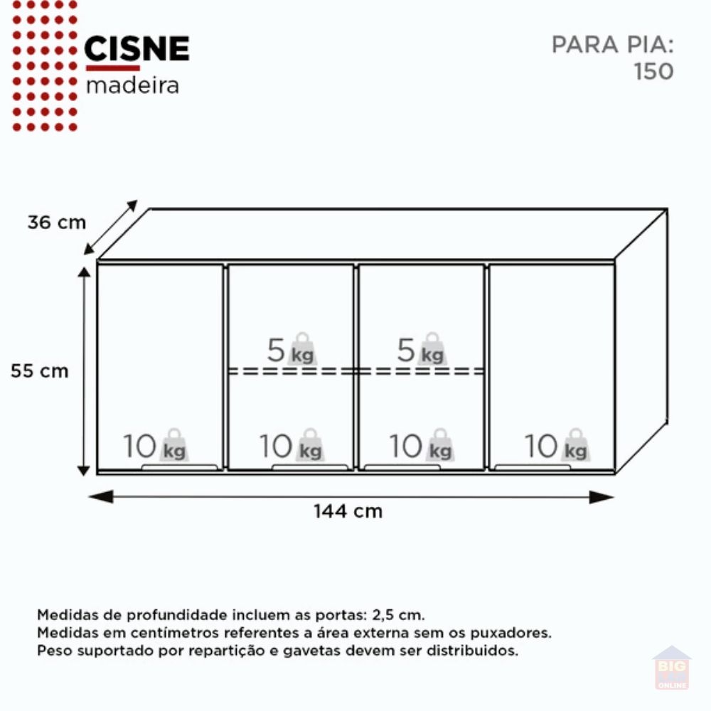O Armário Aéreo para Cozinha Cisne em Madeira 144cm Branco da Cozimax é elegante e sofisticado. É fabricado com chapas de madeira e acabamento em três versões de cores foscas em todo exterior, além de apresentar prateleira, divisão interna para organizar utensílios, puxadores exclusivos em estilo minimalista e dobradiças com amortecimento.