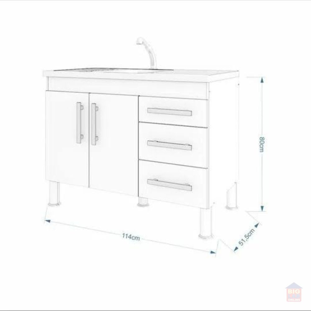 As duas portas são de 15 mm de espessura com puxador em ABS e 3 gavetas com corrediças telescópicas e ainda cinco pés de polipropileno para garantir segurança e durabilidade ao seu balcão de cozinha, assim você pode guardar tranquilamente seus utensílios domésticos e tudo mais que desejar para dar agilidade na hora de cozinhar.