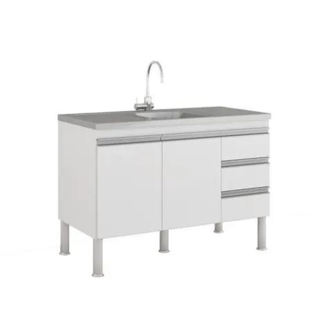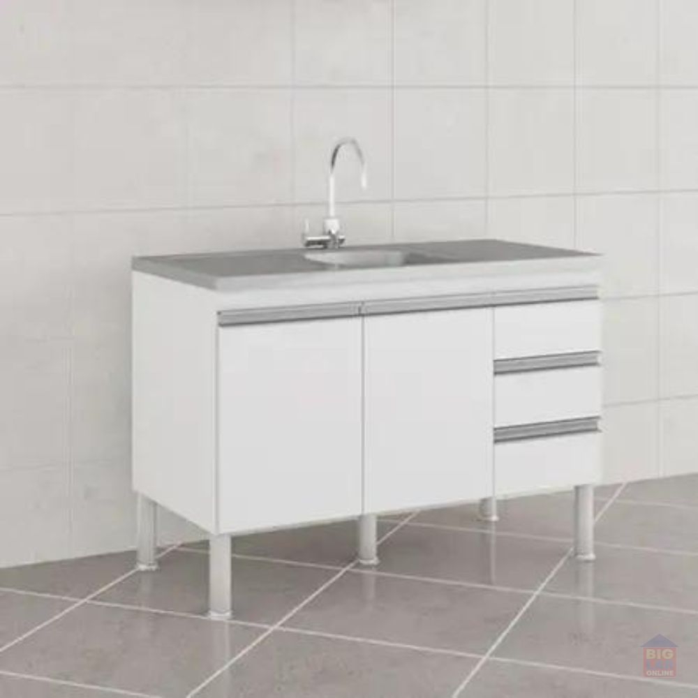 Produto: Balcão Cozinha Ibiza 1,14 Metros Branca, Conteúdo da Embalagem:1 Balcão, 1 Kit de Pés e Puxadores, 1 Manual de Instruções.