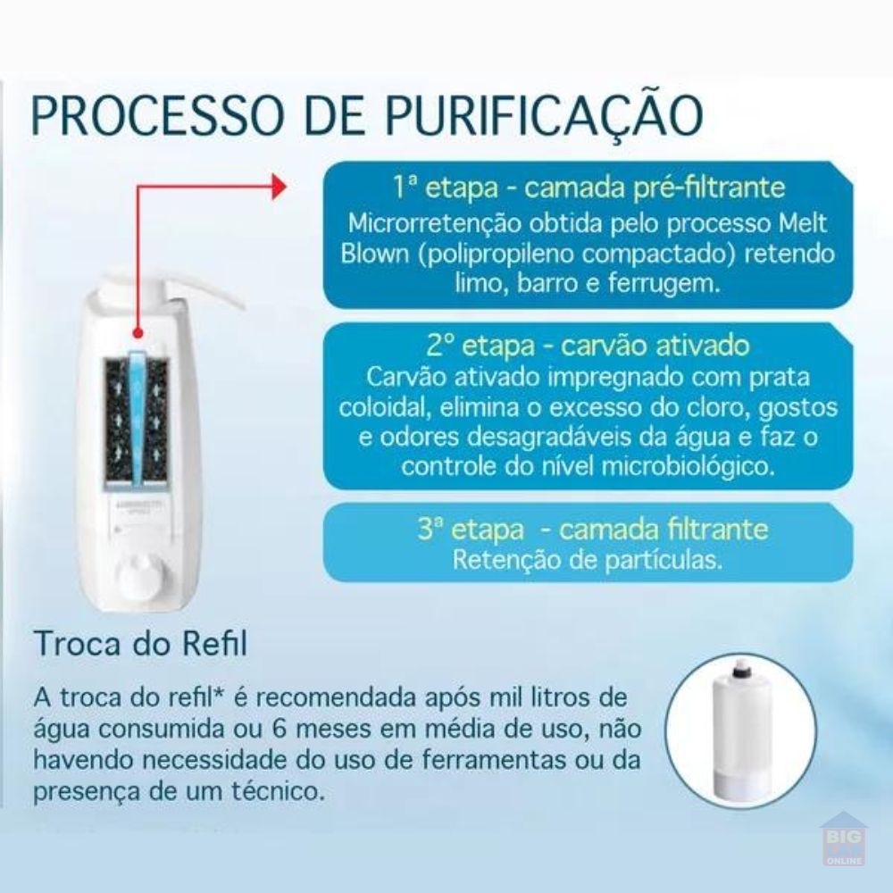 Troca de Refil A troca do refil é recomendada após 1.000 litros de água consumida ou 6 meses em média de uso, não havendo necessidade do uso de ferramentas ou da presença de um técnico.
