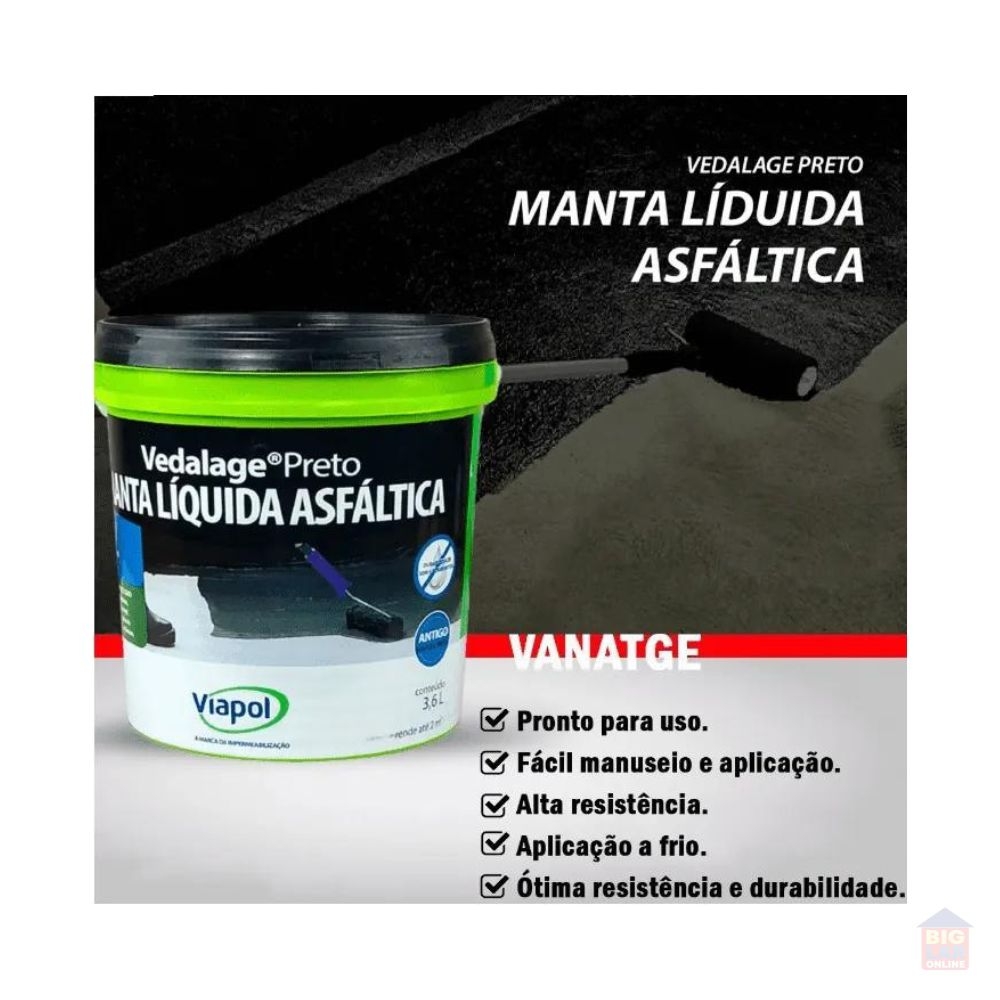 A Manta Líquida Asfáltica Vedalage Preta 3,6 Litros da Viapol é produzida à base de asfalto modificado com polímeros e já vem pronta para uso. É um impermeabilizante que apresenta excelentes características de elasticidade, flexibilidade e aderência. Ao ser aplicada a frio forma uma membrana contínua e sem emendas. Pode ser utilizada em paredes e pisos; lajes de cobertura, áreas frias (banheiro/cozinha); muros de contenção; jardineiras e floreiras; saunas; câmaras frigoríficas e calhas de concreto.