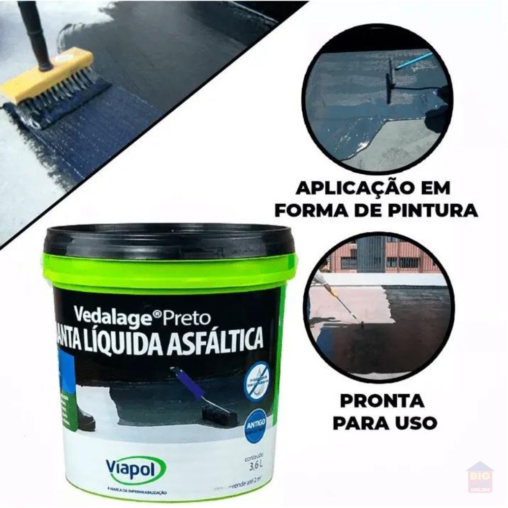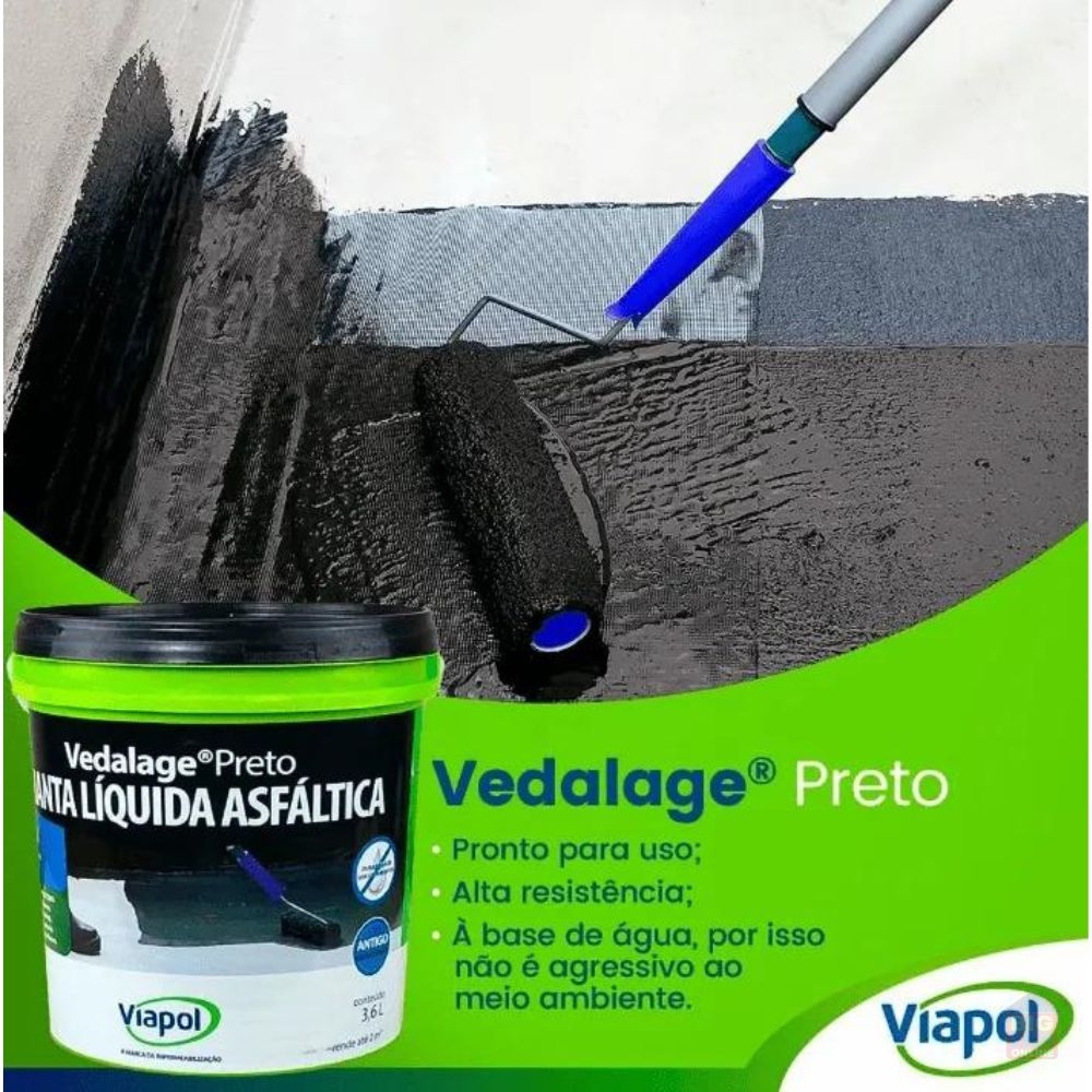 A Manta Líquida Asfáltica Vedalage Preta 3,6 Litros da Viapol é produzida à base de asfalto modificado com polímeros e já vem pronta para uso. É um impermeabilizante que apresenta excelentes características de elasticidade, flexibilidade e aderência. Ao ser aplicada a frio forma uma membrana contínua e sem emendas. Pode ser utilizada em paredes e pisos; lajes de cobertura, áreas frias (banheiro/cozinha); muros de contenção; jardineiras e floreiras; saunas; câmaras frigoríficas e calhas de concreto.