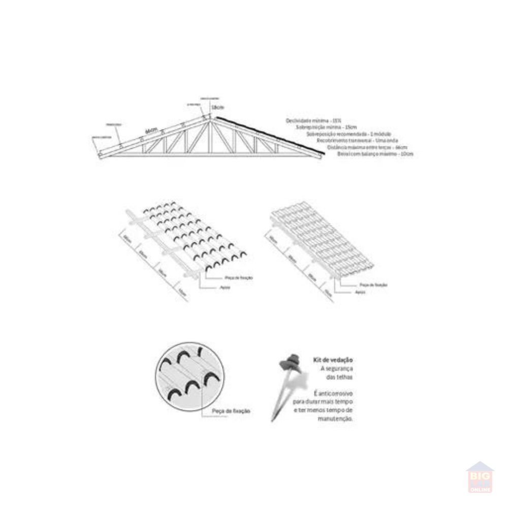 Para melhor estanqueidade de sua cobertura e desempenho contra arrancamento, utilize os kits especiais de vedação Fortlev. A utilização dos kits de vedação Fortlev é obrigatória para o bom desempenho do sistema de cobertura, conforme exigido na NBR 15.575. Não acompanha parafusos.