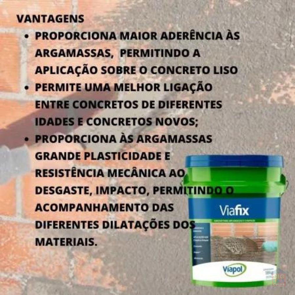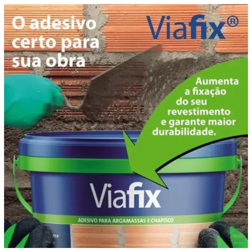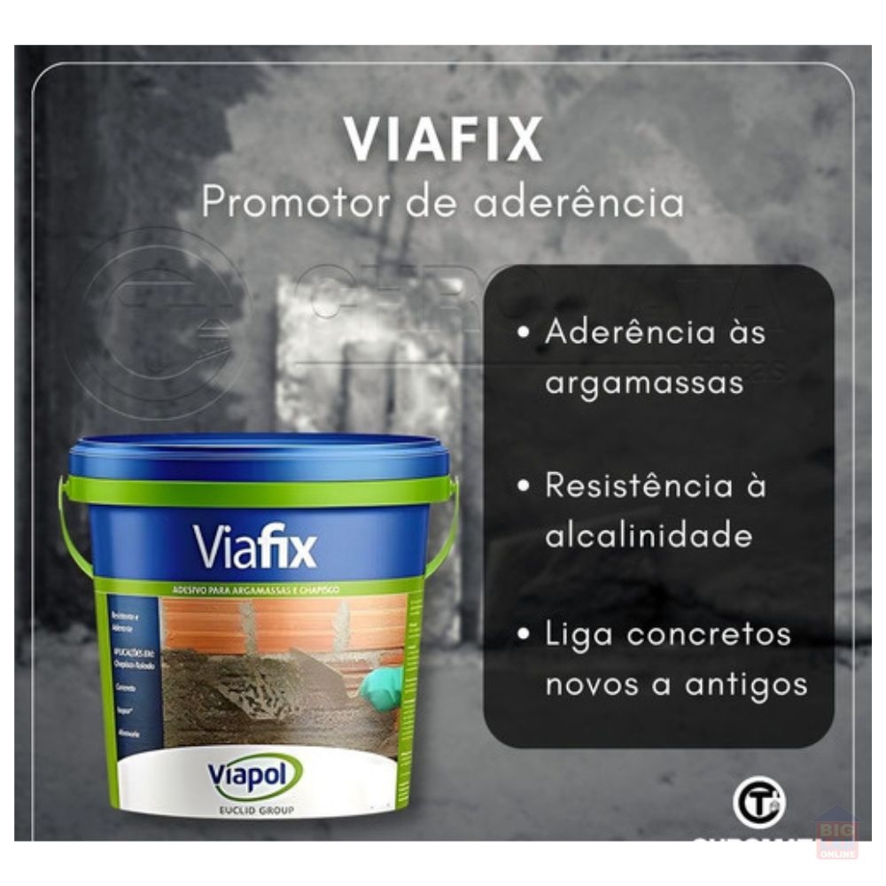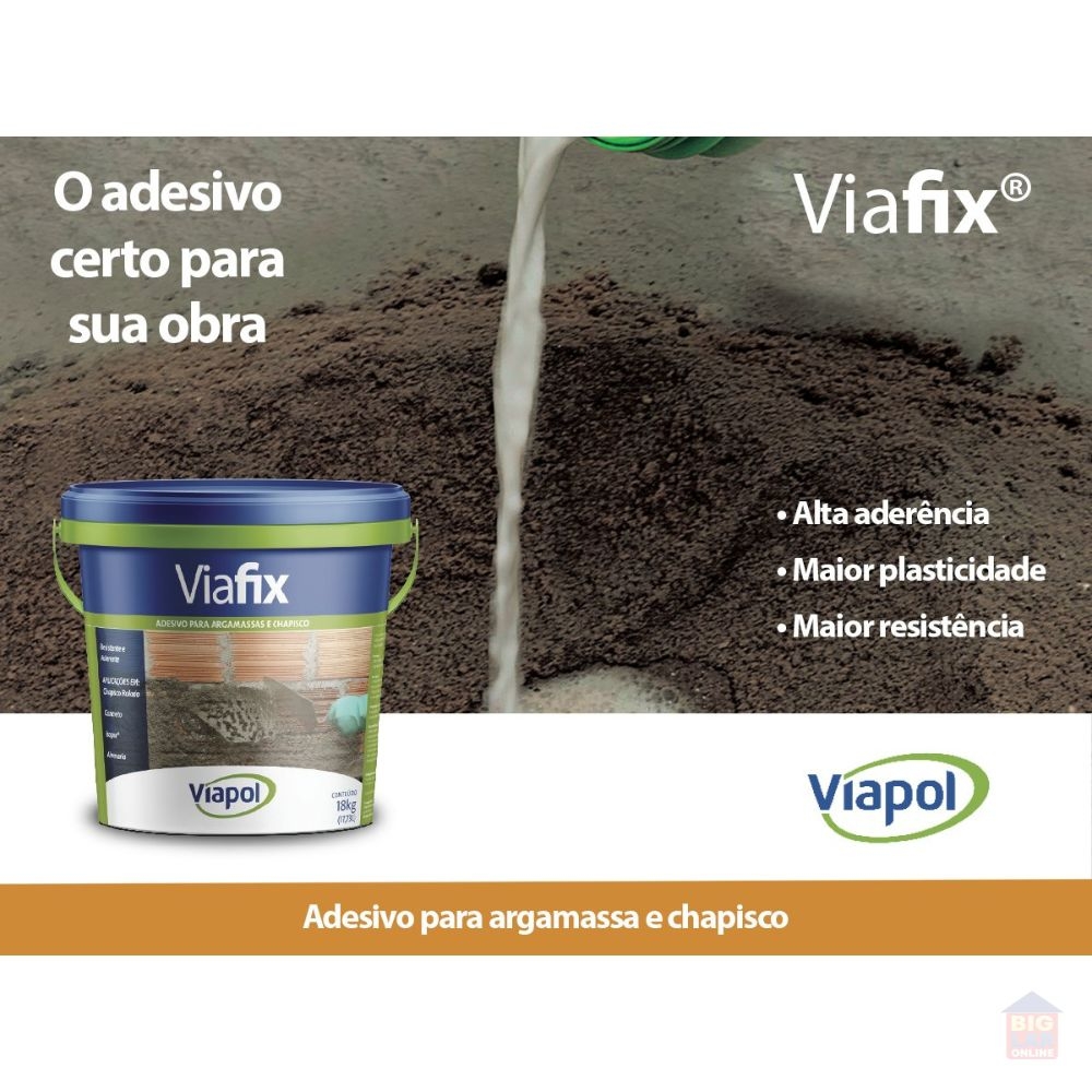 O Adesivo para Argamassas e Chapisco Viafix 18kg da Viapol é uma emulsão adesiva à base de resinas especiais (PVA) de alto desempenho, compatível com cimento e cal, utilizada como promotor de aderência para concreto, argamassa e chapiscos, com excelentes propriedades de plasticidade. Indicado para rebocos e emboços, argamassas de regularização, argamassas de assentamento de pisos e azulejos, argamassas de contra piso, chapisco sobre isopor e plastificante para gesso.
