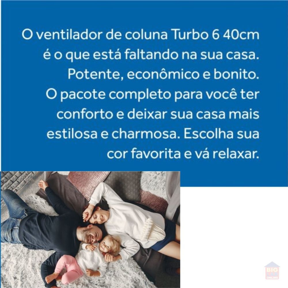 Se você deseja um ambiente mais refrescante e agradável, o Ventilador de Coluna Ventisol Turbo 6 40cm é perfeito. Seu Motor Turbo junto com sua hélice de 6 pás com nova aerodinâmica são silenciosos e geram uma maior ventilação no aparelho.