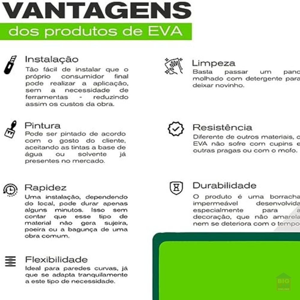 Produzido de EVA específico para a decoração, nossos produtos tem flexibilidade que garantem fácil aplicação em ambientes curvos ou com irregularidades.