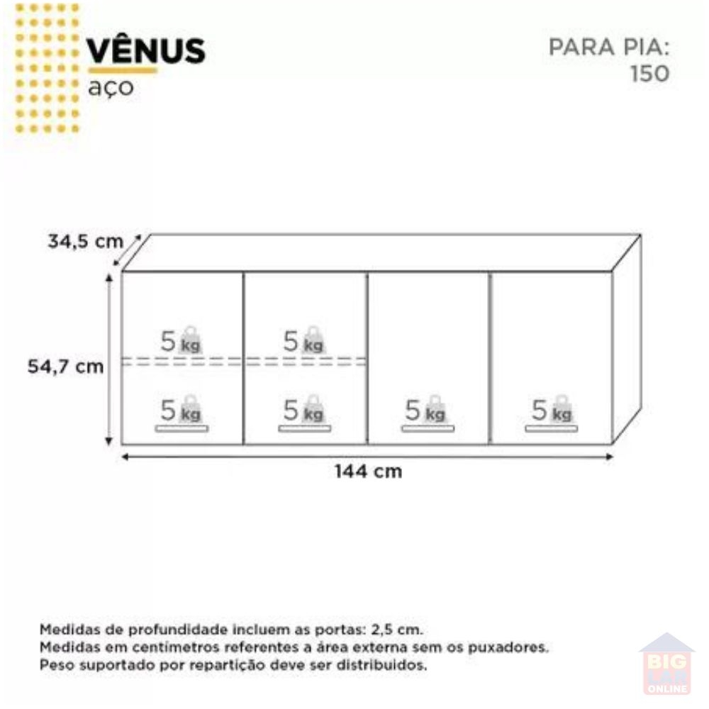 Armário Aéreo de Cozinha Vênus é mais um excelente complemento que vai completar sua cozinha com beleza e praticidade. Fabricado em aço galvanizado "25 vezes mais resistente", o armário de parede Vênus possui portas articuladas com dobradiças de pressão, 01 prateleira interna e puxadores resistentes. Ah! Para garantir toda qualidade do produto ele tem 4 anos de garantia contra defeito de fabricação.