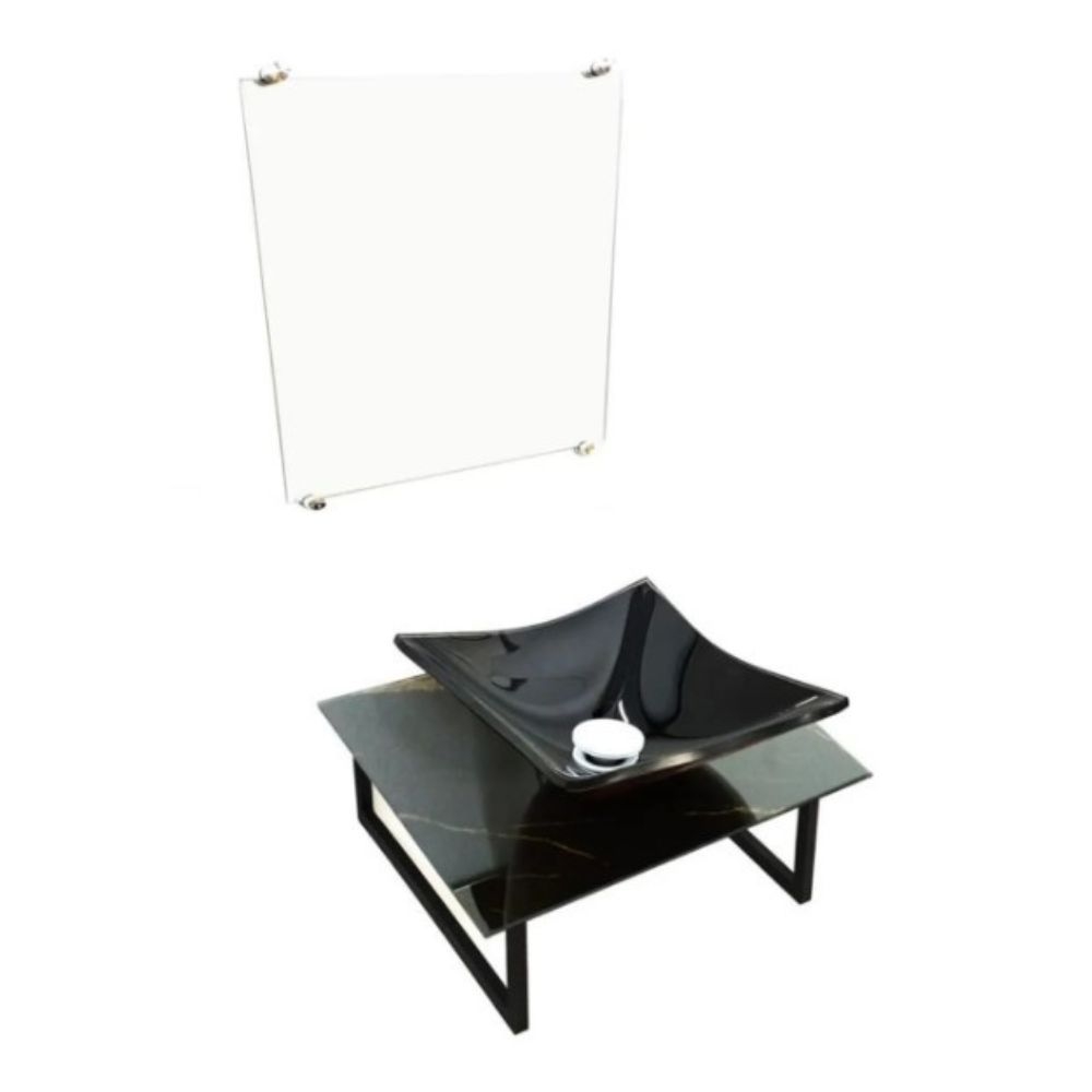 Itens Inclusos: > Bancada de vidro, cuba de vidro quadrada, prateleira de vidro, espelheira, porta toalha, válvula e kit parafusos para instalação.