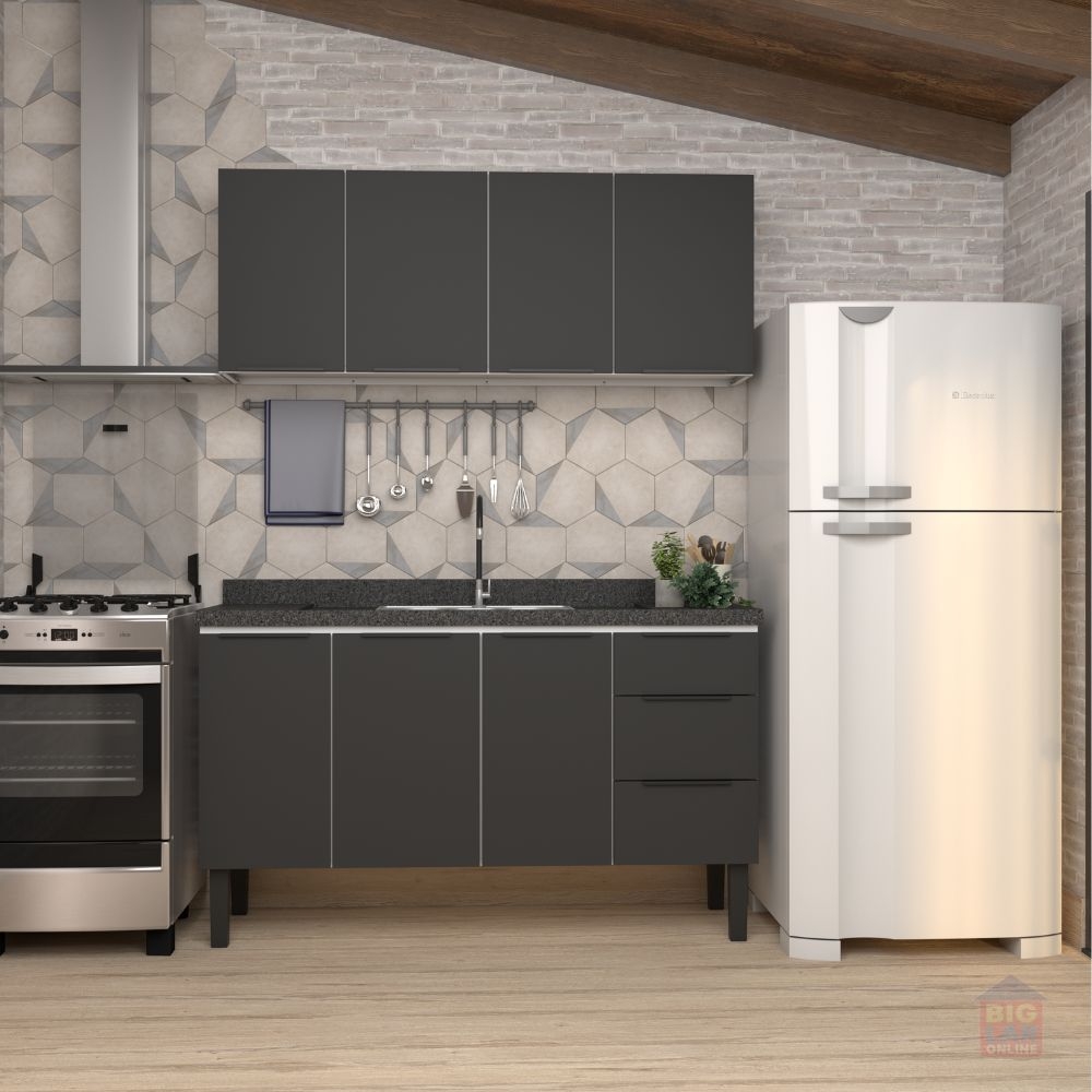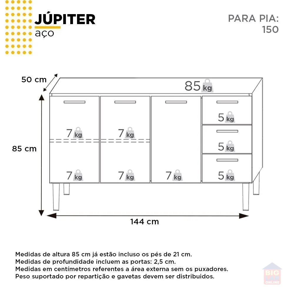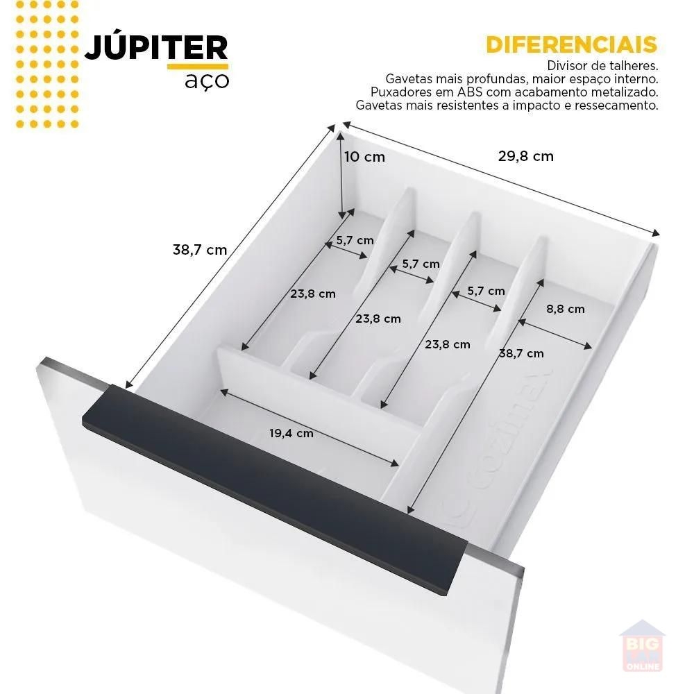 A linha de armários em aço para cozinha Júpiter, da Cozimax, é resistente, fabricado em aço eletrogalvanizado com garantia de 5 anos, protegido por pintura em pó eletrostática, possui design moderno com cantos retos, prateleiras internas e puxadores em aço eletrogalvanizado.