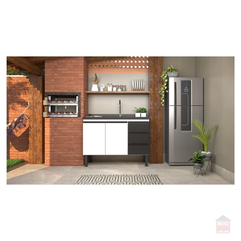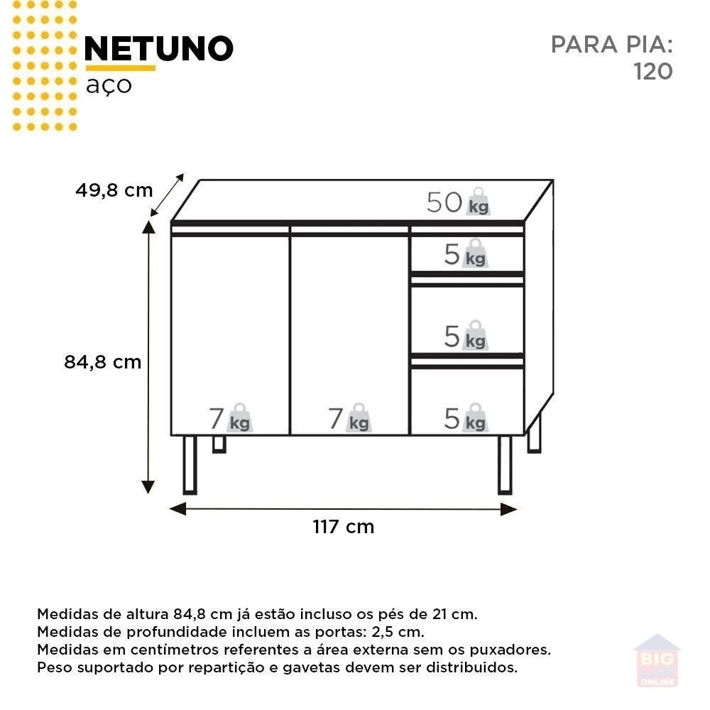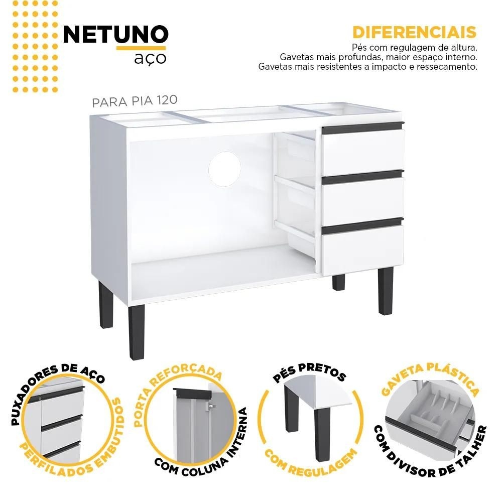 A linha de gabinetes para cozinha Netuno, da Cozimax, é fabricada com chapas de aço eletrogalvanizado, que garante maior durabilidade e praticidade de limpeza no dia-a-dia, possui amplo espaço interno, uma gaveta plástica com divisor de talheres e outras duas gavetas para organizar objetos, puxadores exclusivos em perfil de aço e pés na cor preta com regulagem de altura.