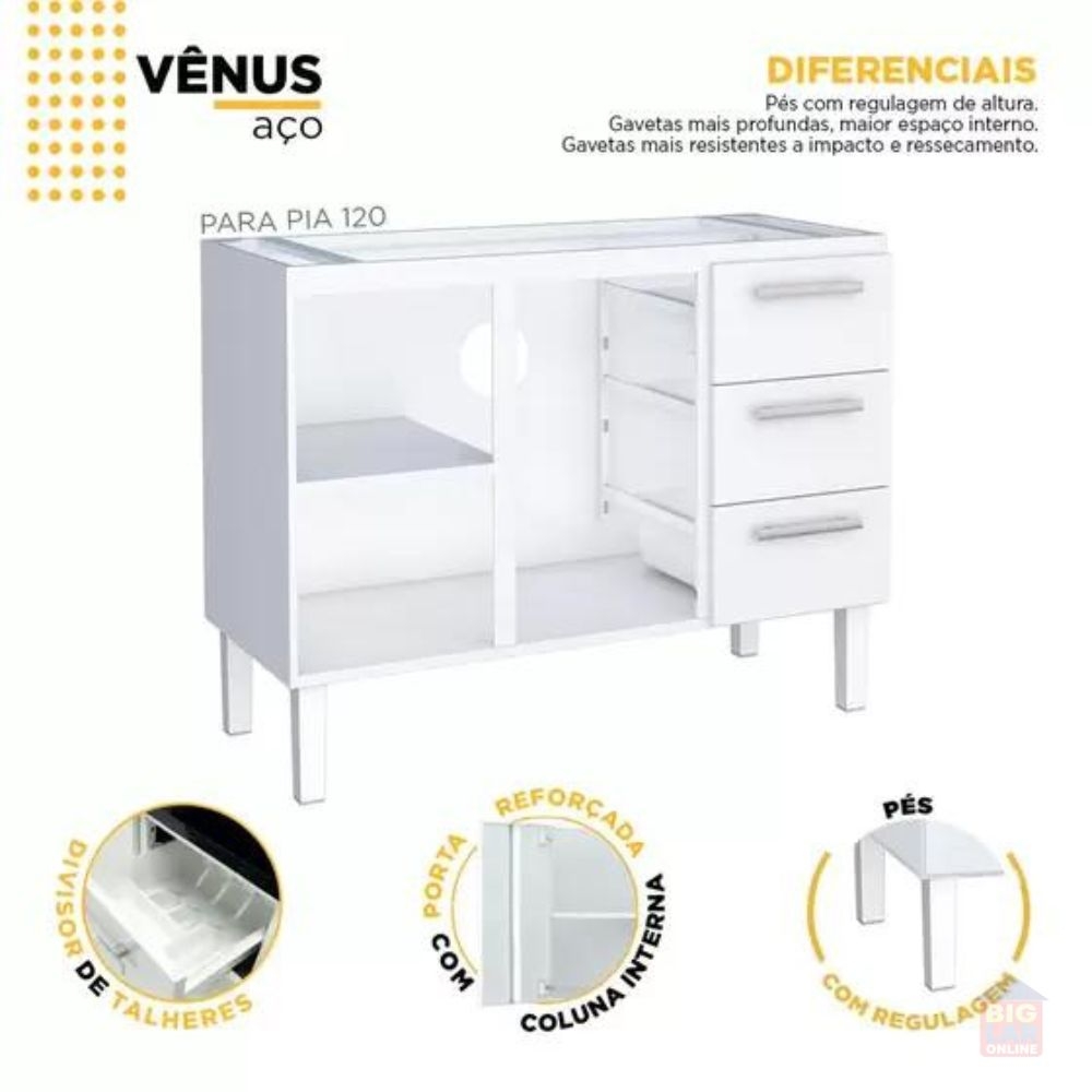 O Gabinete de Cozinha em Aço para Pia 120cm Cozimax Vênus Flat Branco é composto de aço eletro galvanizado e alumínio de excelente qualidade, pés com regulagem de altura e gavetas com divisórias de talheres que não ressecam.